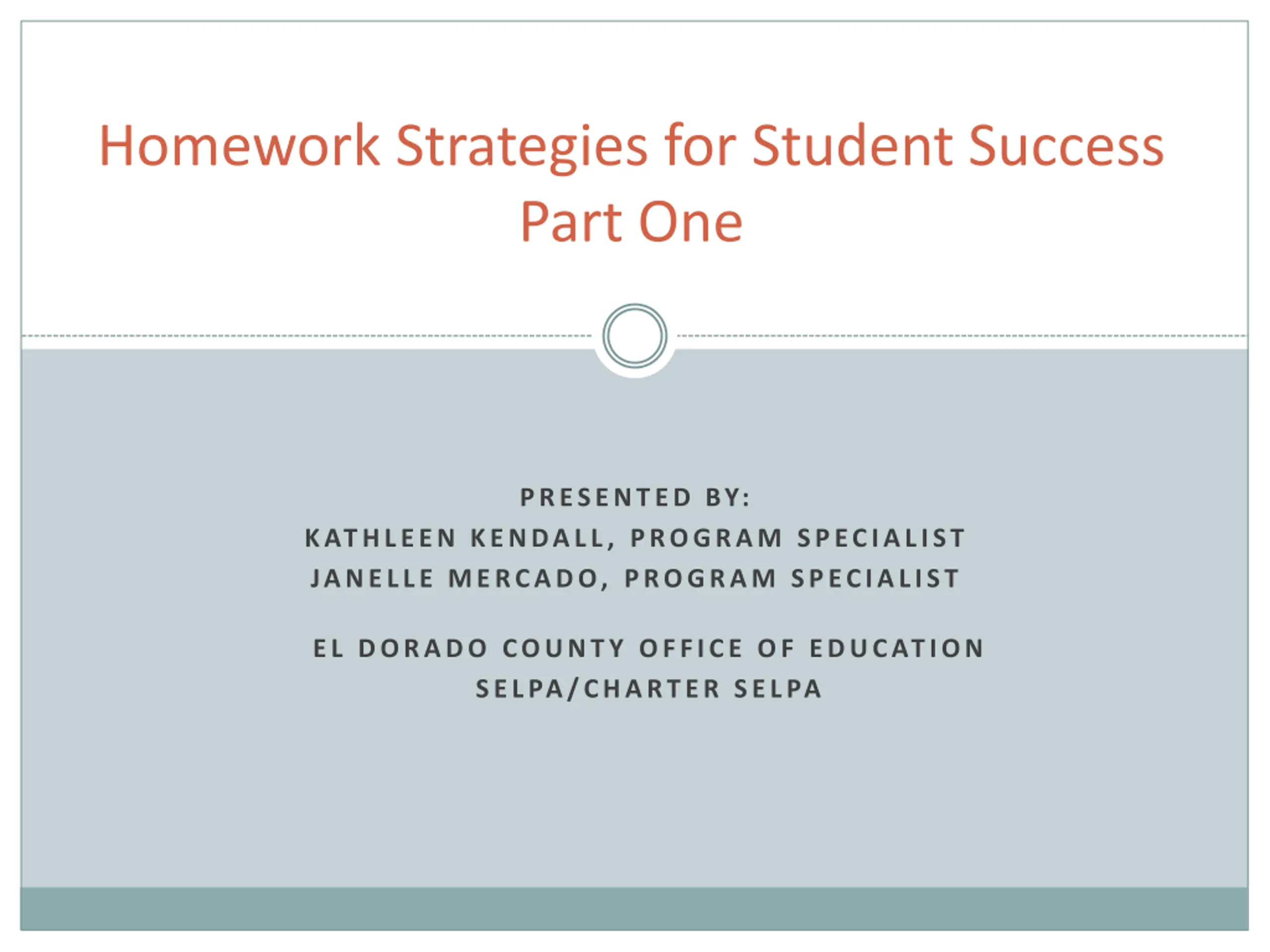 Homework Strategies for Student Success Part One PRESENTED BY: KATHLEEN KENDALL, PROGRAM SPECIALIST JANELLE MERCADO, PROGRAM SPECIALIST EL DORADO COUNTY OFFICE OF EDUCATION SELPA/CHARTER SELPA