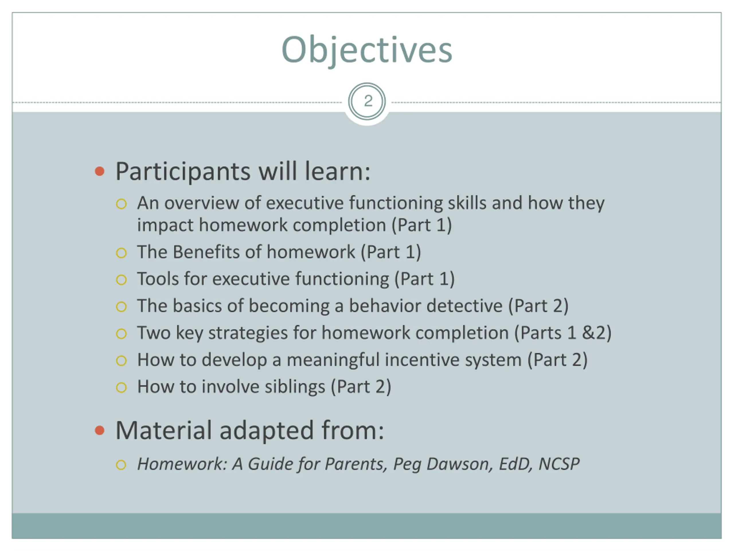 Objectives 2 Participants will learn: An overview of executive functioning skills and how they impact homework completion (Part 1) The Benefits of homework (Part 1) Tools for executive functioning (Part 1) The basics of becoming a behavior detective (Part 2) Two key strategies for homework completion (Parts 1 &2) How to develop a meaningful incentive system (Part 2) How to involve siblings (Part 2) Material adapted from: Homework: A Guide for Parents, Peg Dawson, EdD, NCSP