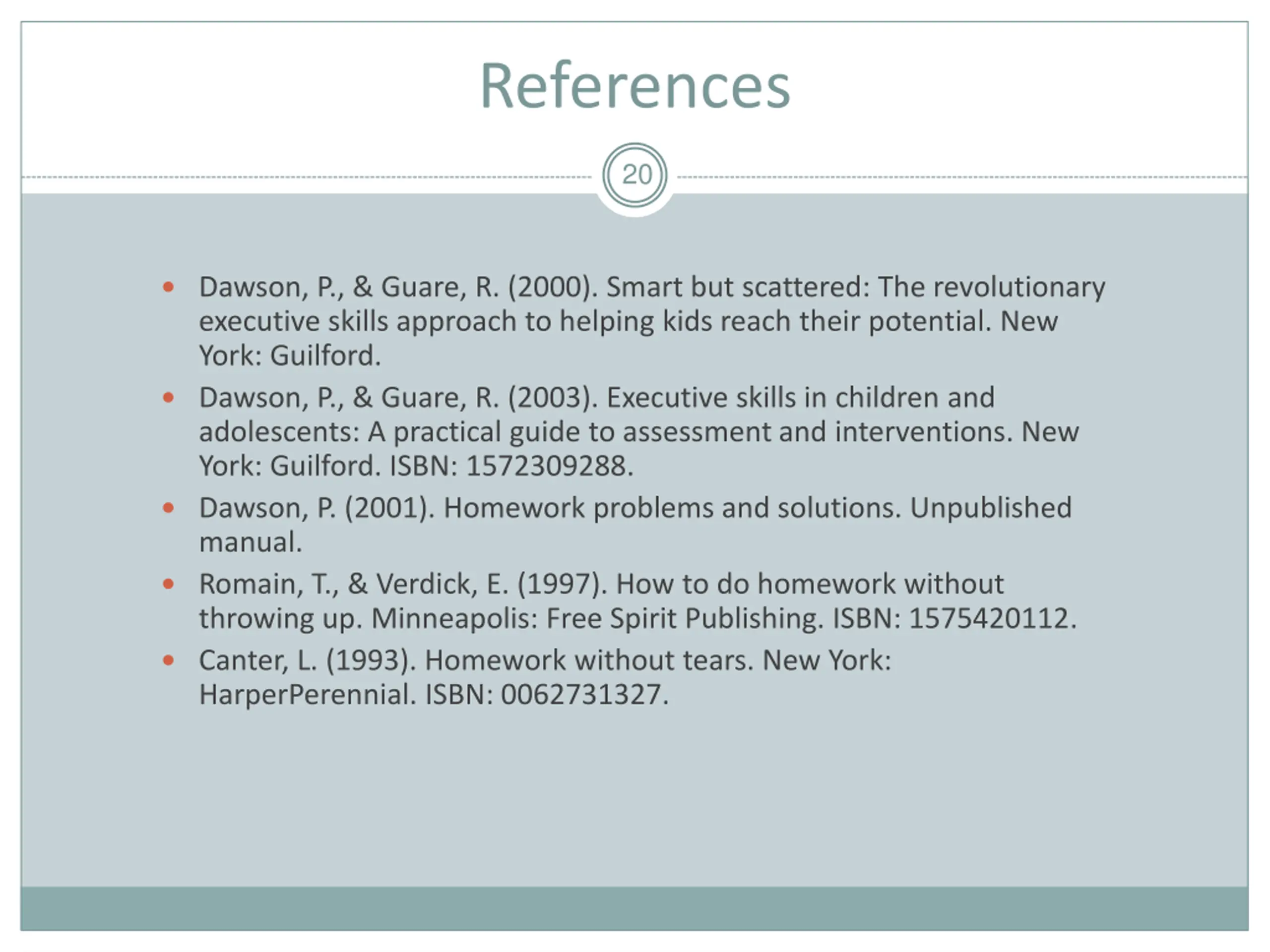 References 20 Dawson, P., & Guare, R. (2000). Smart but scattered: The revolutionary executive skills approach to helping kids reach their potential. New York: Guilford. Dawson, P., & Guare, R. (2003). Executive skills in children and adolescents: A practical guide to assessment and interventions. New York: Guilford. ISBN: 1572309288. Dawson, P. (2001). Homework problems and solutions. Unpublished manual. Romain, T., & Verdick, E. (1997). How to do homework without throwing up. Minneapolis: Free Spirit Publishing. ISBN: 1575420112. Canter, L. (1993). Homework without tears. New York: HarperPerennial. ISBN: 0062731327.