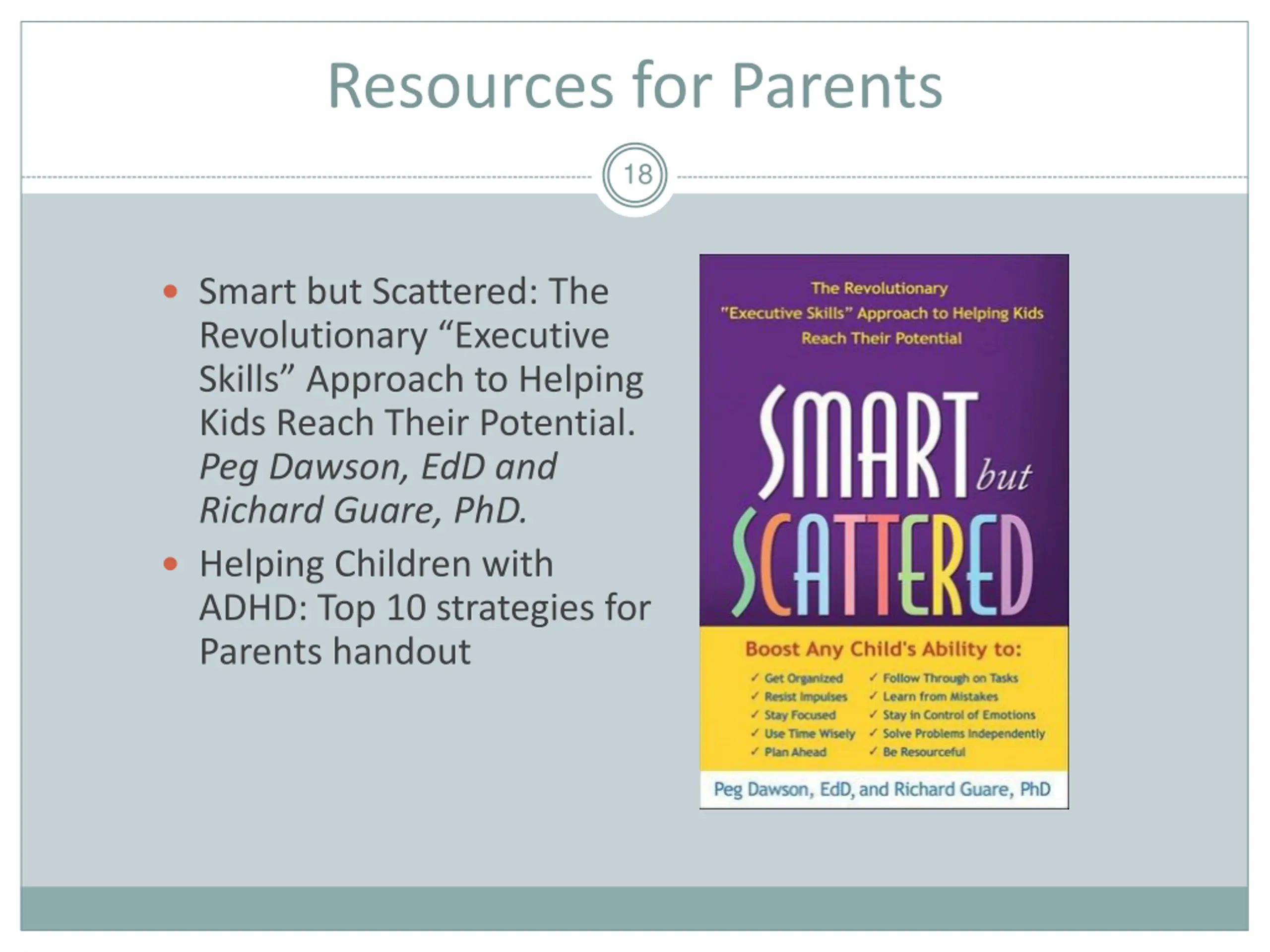 Resources for Parents 18 Smart but Scattered: The Revolutionary Executive Skills Approach to Helping Kids Reach Their Potential. Peg Dawson, EdD and Richard Guare, PhD. Helping Children with ADHD: Top 10 strategies for Parents handout