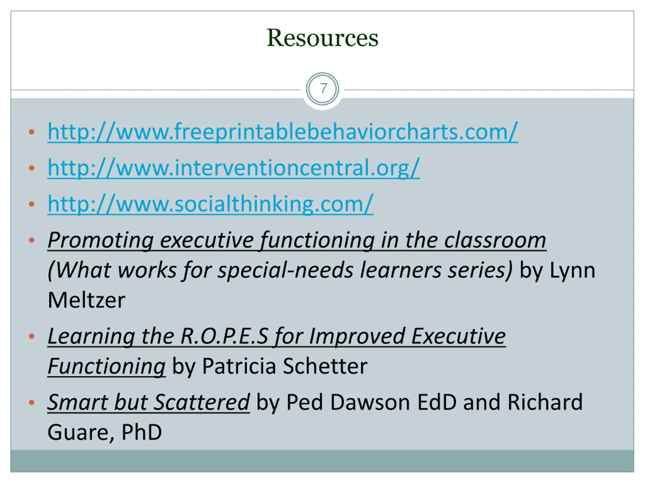 Resources 7 http://www.freeprintablebehaviorcharts.com/ http://www.interventioncentral.org/ http://www.socialthinking.com/ Promoting executive functioning in the classroom (What works for special-needs learners series) by Lynn Meltzer Learning the R.O.P.E.S for Improved Executive Functioning by Patricia Schetter Smart but Scattered by Ped Dawson EdD and Richard Guare, PhD