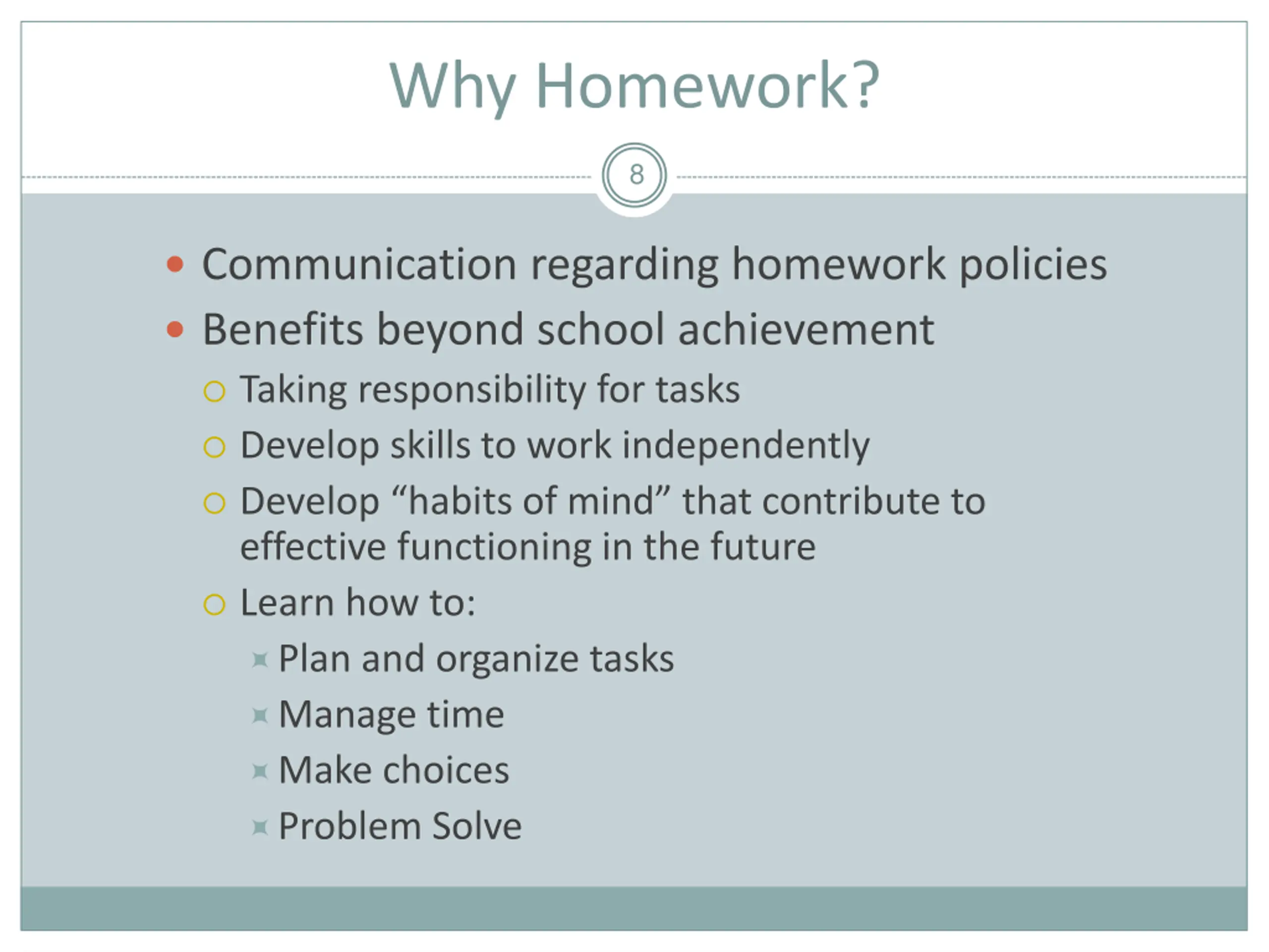 Why Homework? 8 Communication regarding homework policies Benefits beyond school achievement Taking responsibility for tasks Develop skills to work independently Develop habits of mind that contribute to effective functioning in the future Learn how to: Plan and organize tasks Manage time Make choices Problem Solve
