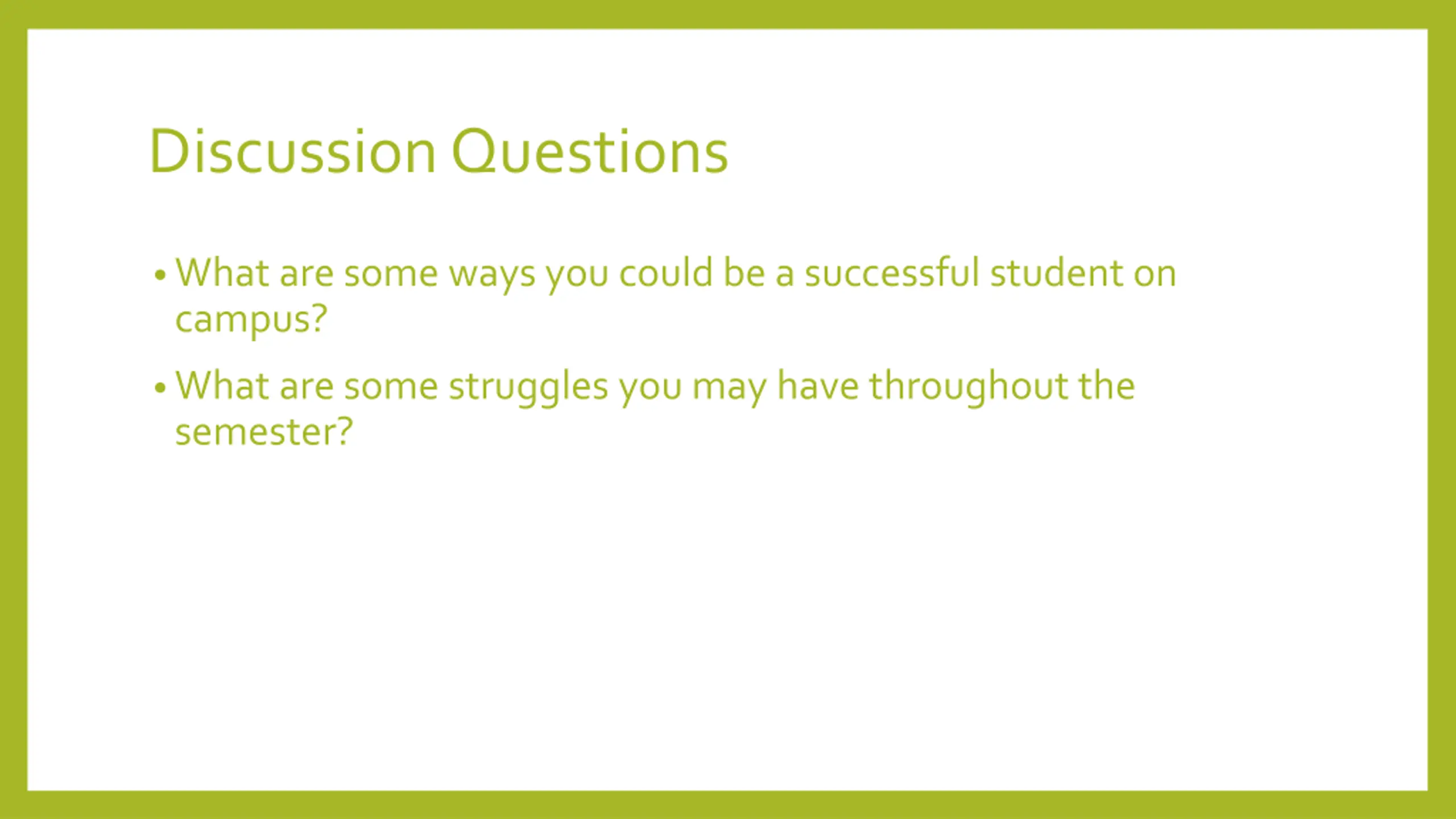 Discussion Questions What are some ways you could be a successful student on campus? What are some struggles you may have throughout the semester?