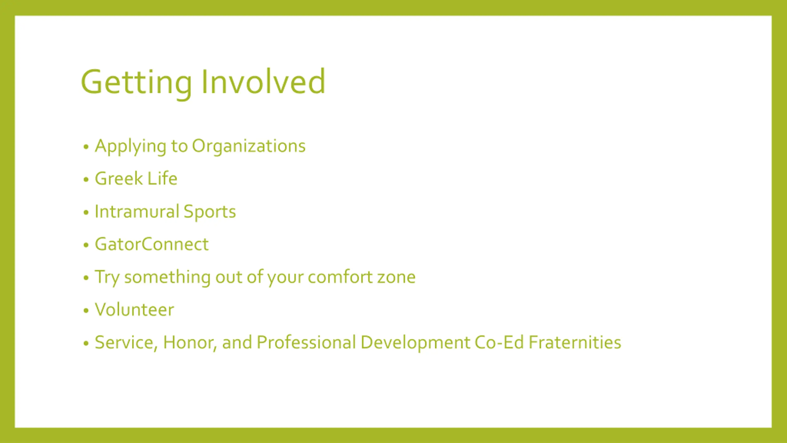 Getting Involved Applying to Organizations Greek Life Intramural Sports GatorConnect Try something out of your comfort zone Volunteer Service, Honor, and Professional Development Co-Ed Fraternities