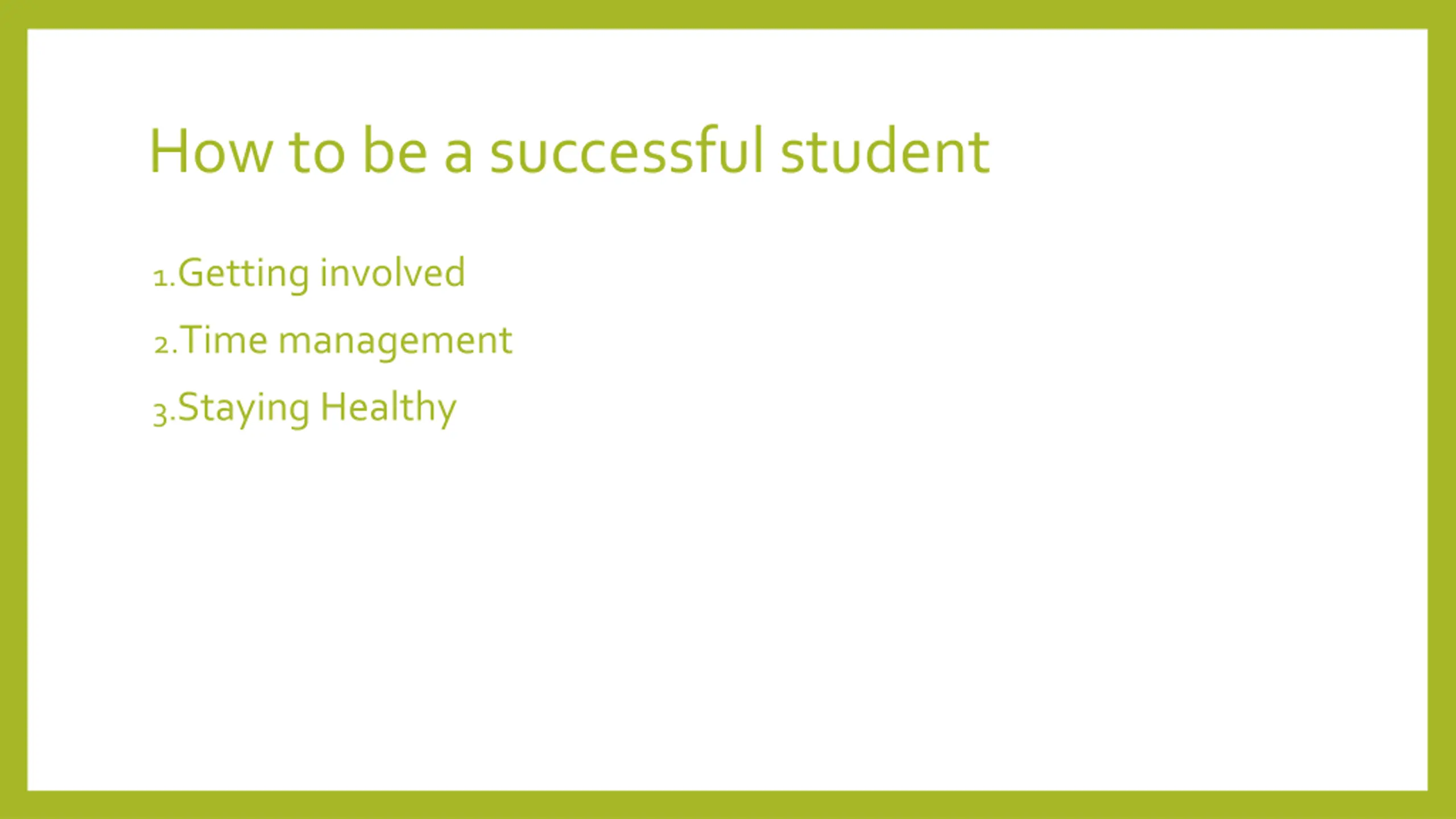 How to be a successful student 1.Getting involved 2.Time management 3.Staying Healthy