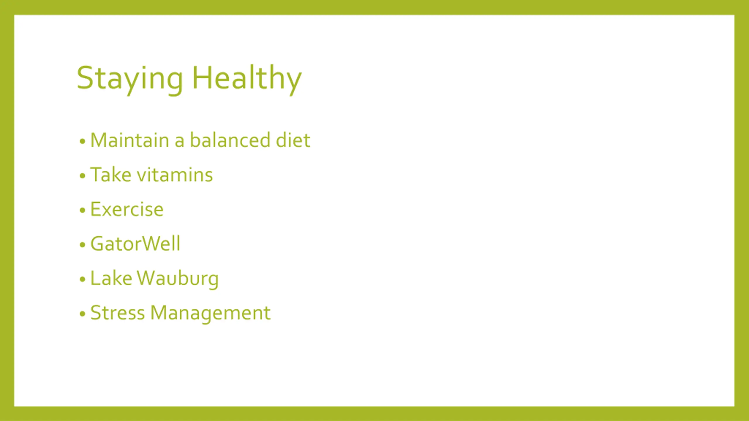 Staying Healthy Maintain a balanced diet Take vitamins Exercise GatorWell Lake Wauburg Stress Management