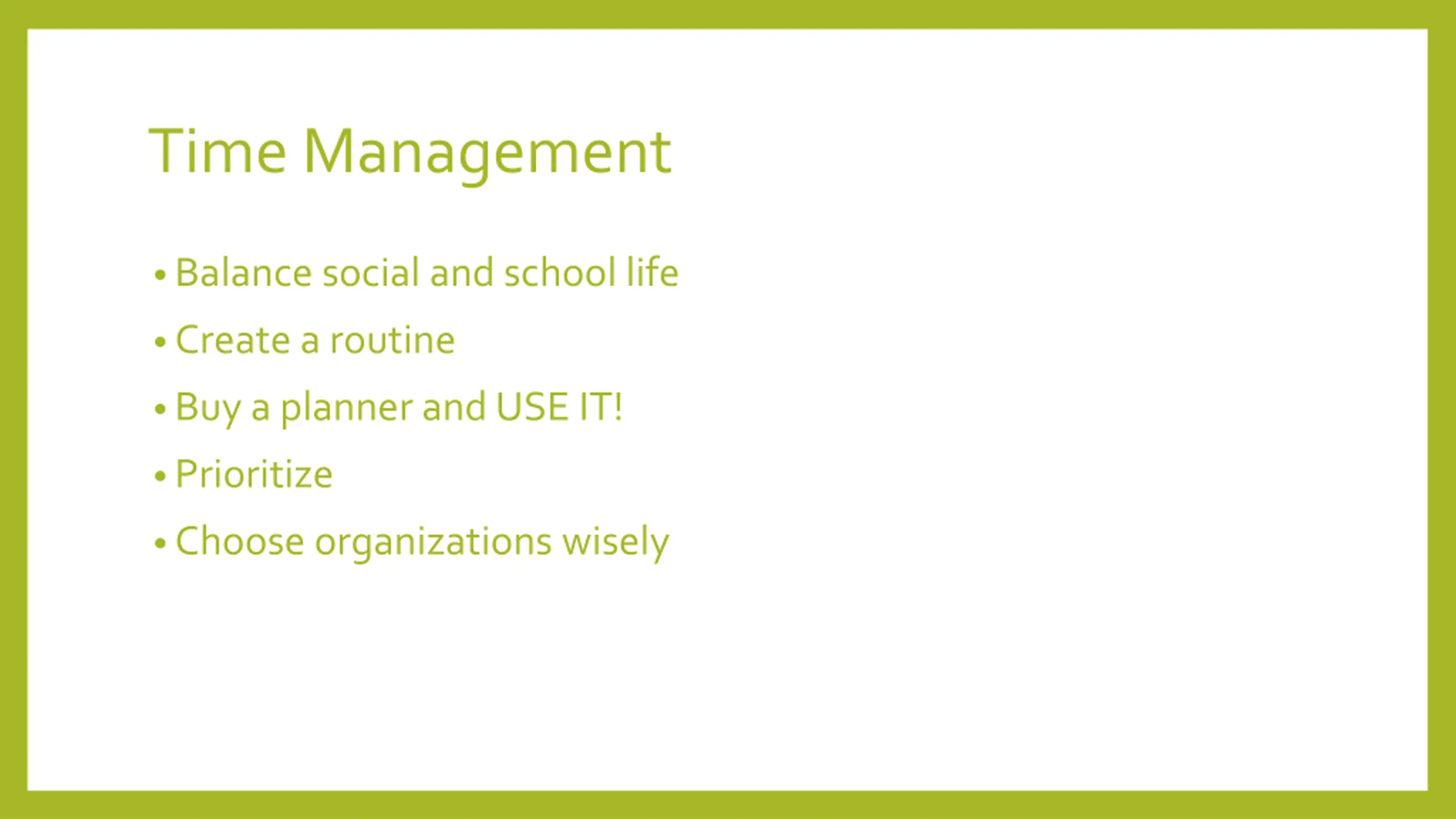 Time Management Balance social and school life Create a routine Buy a planner and USE IT! Prioritize Choose organizations wisely