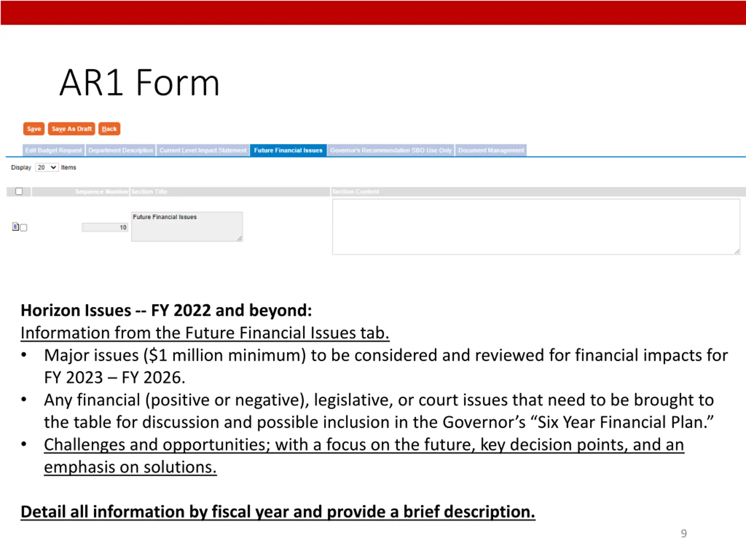 AR1 Form Horizon Issues -- FY 2022 and beyond: Information from the Future Financial Issues tab. Major issues ($1 million minimum) to be considered and reviewed for financial impacts for FY 2023 FY 2026. Any financial (positive or negative), legislative, or court issues that need to be brought to the table for discussion and possible inclusion in the Governor s Six Year Financial Plan. Challenges and opportunities; with a focus on the future, key decision points, and an emphasis on solutions. Detail all information by fiscal year and provide a brief description. 9