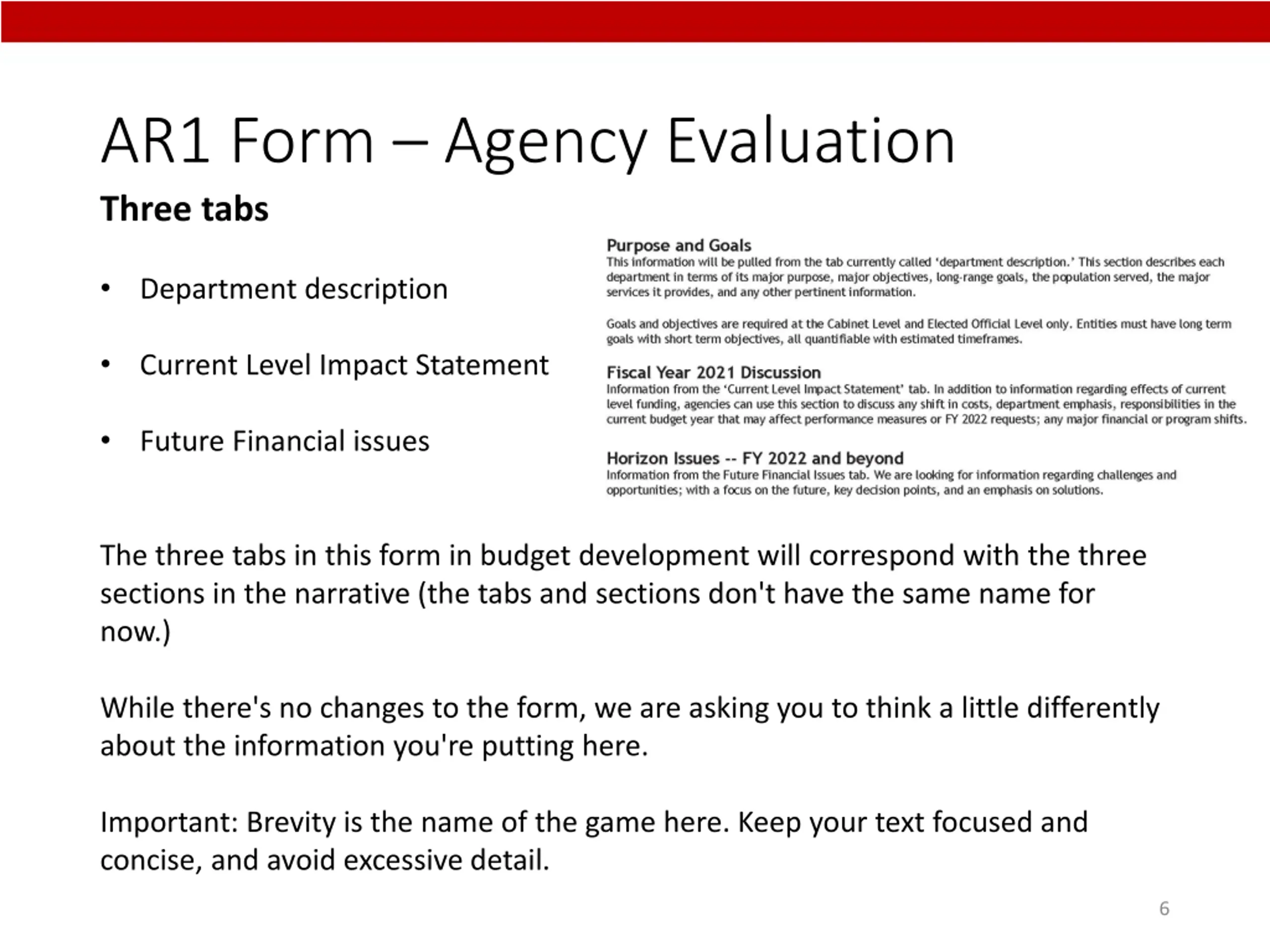 AR1 Form Agency Evaluation Three tabs Department description Current Level Impact Statement Future Financial issues The three tabs in this form in budget development will correspond with the three sections in the narrative (the tabs and sections don't have the same name for now.) While there's no changes to the form, we are asking you to think a little differently about the information you're putting here. Important: Brevity is the name of the game here. Keep your text focused and concise, and avoid excessive detail. 6