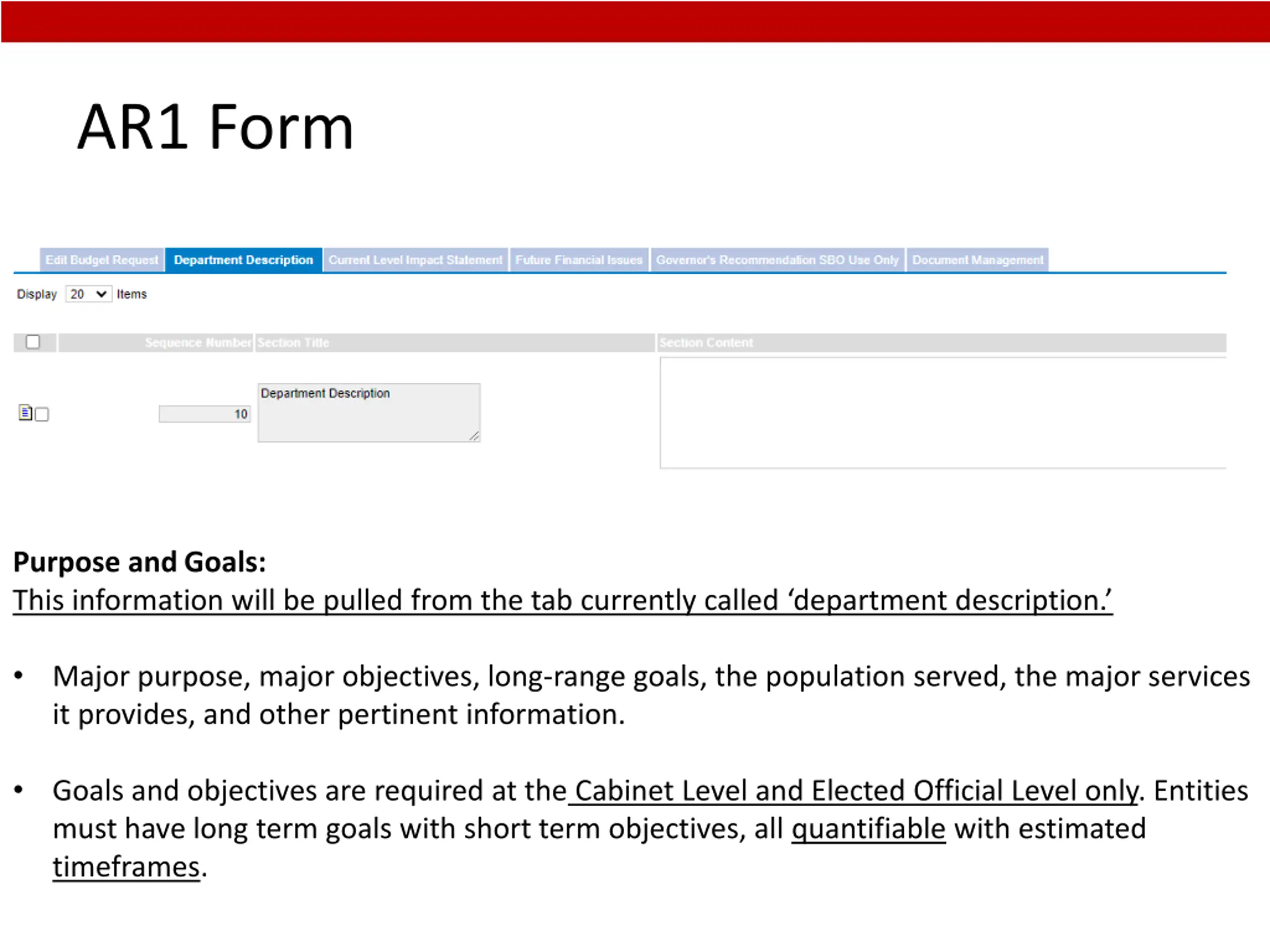 AR1 Form Purpose and Goals: This information will be pulled from the tab currently called department description. Major purpose, major objectives, long-range goals, the population served, the major services it provides, and other pertinent information. Goals and objectives are required at the Cabinet Level and Elected Official Level only. Entities must have long term goals with short term objectives, all quantifiable with estimated timeframes. 7