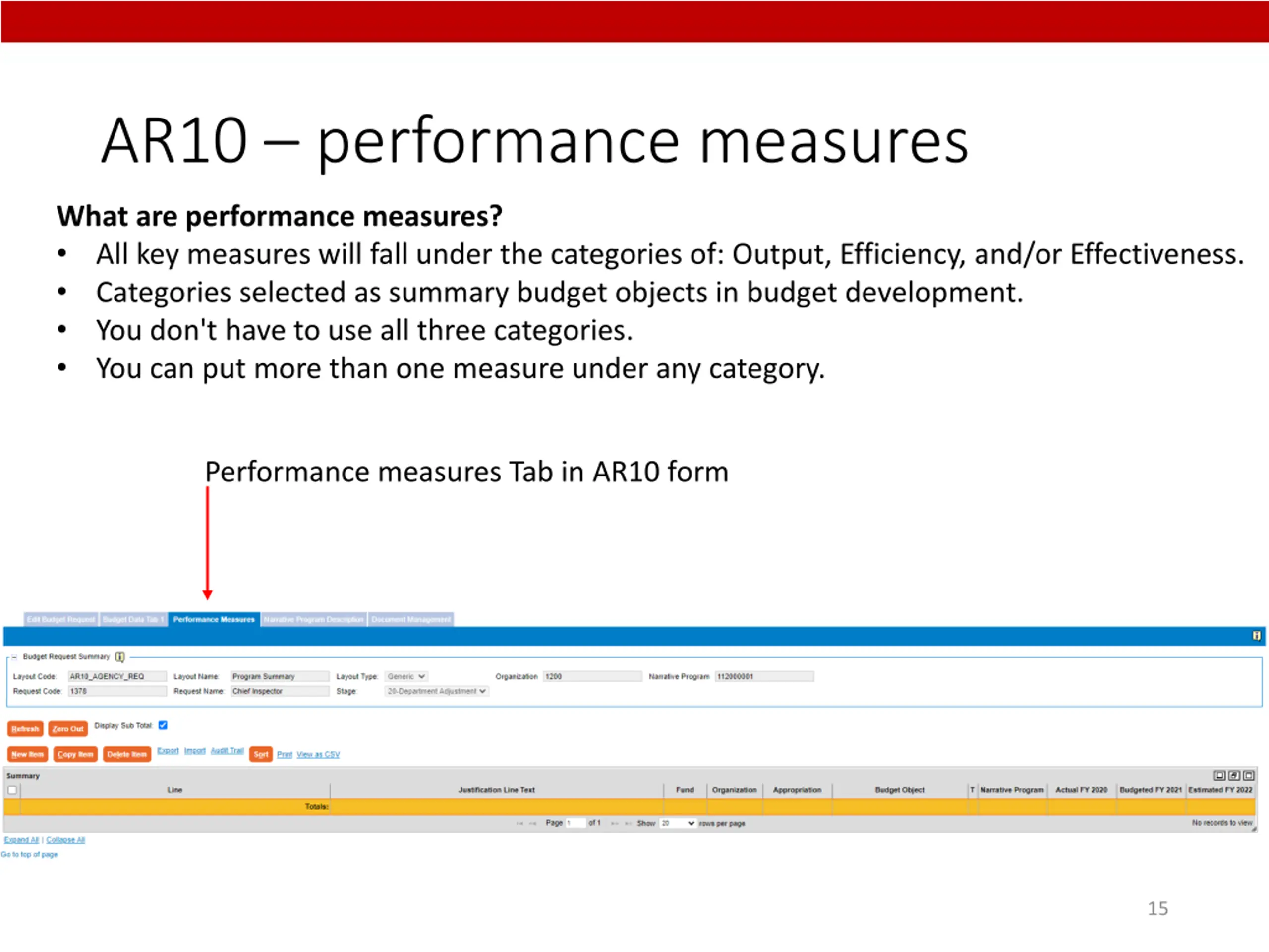 AR10 performance measures What are performance measures? All key measures will fall under the categories of: Output, Efficiency, and/or Effectiveness. Categories selected as summary budget objects in budget development. You don't have to use all three categories. You can put more than one measure under any category. Performance measures Tab in AR10 form 15