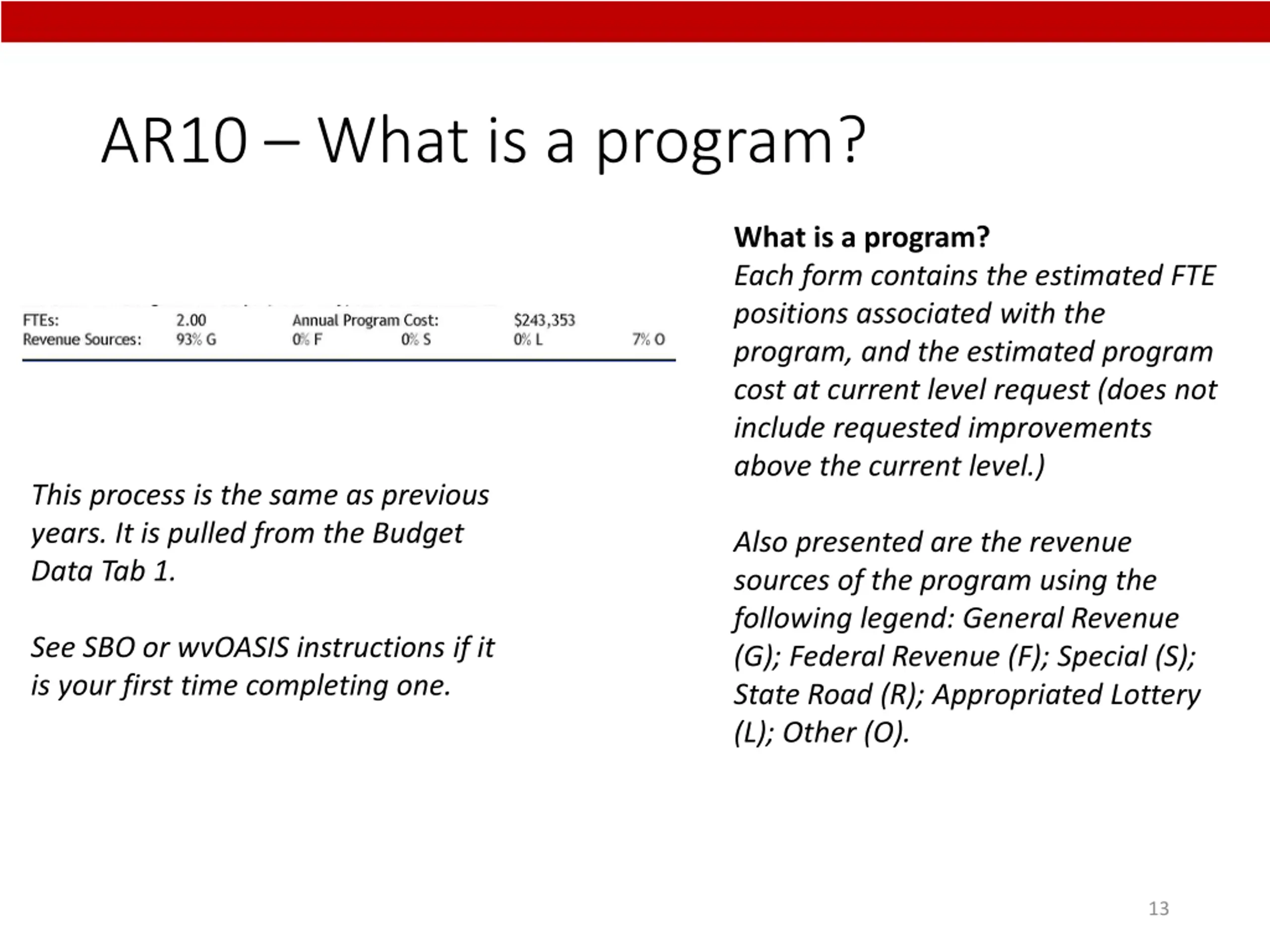 AR10 What is a program? What is a program? Each form contains the estimated FTE positions associated with the program, and the estimated program cost at current level request (does not include requested improvements above the current level.) This process is the same as previous years. It is pulled from the Budget Data Tab 1. Also presented are the revenue sources of the program using the following legend: General Revenue (G); Federal Revenue (F); Special (S); State Road (R); Appropriated Lottery (L); Other (O). See SBO or wvOASIS instructions if it is your first time completing one. 13