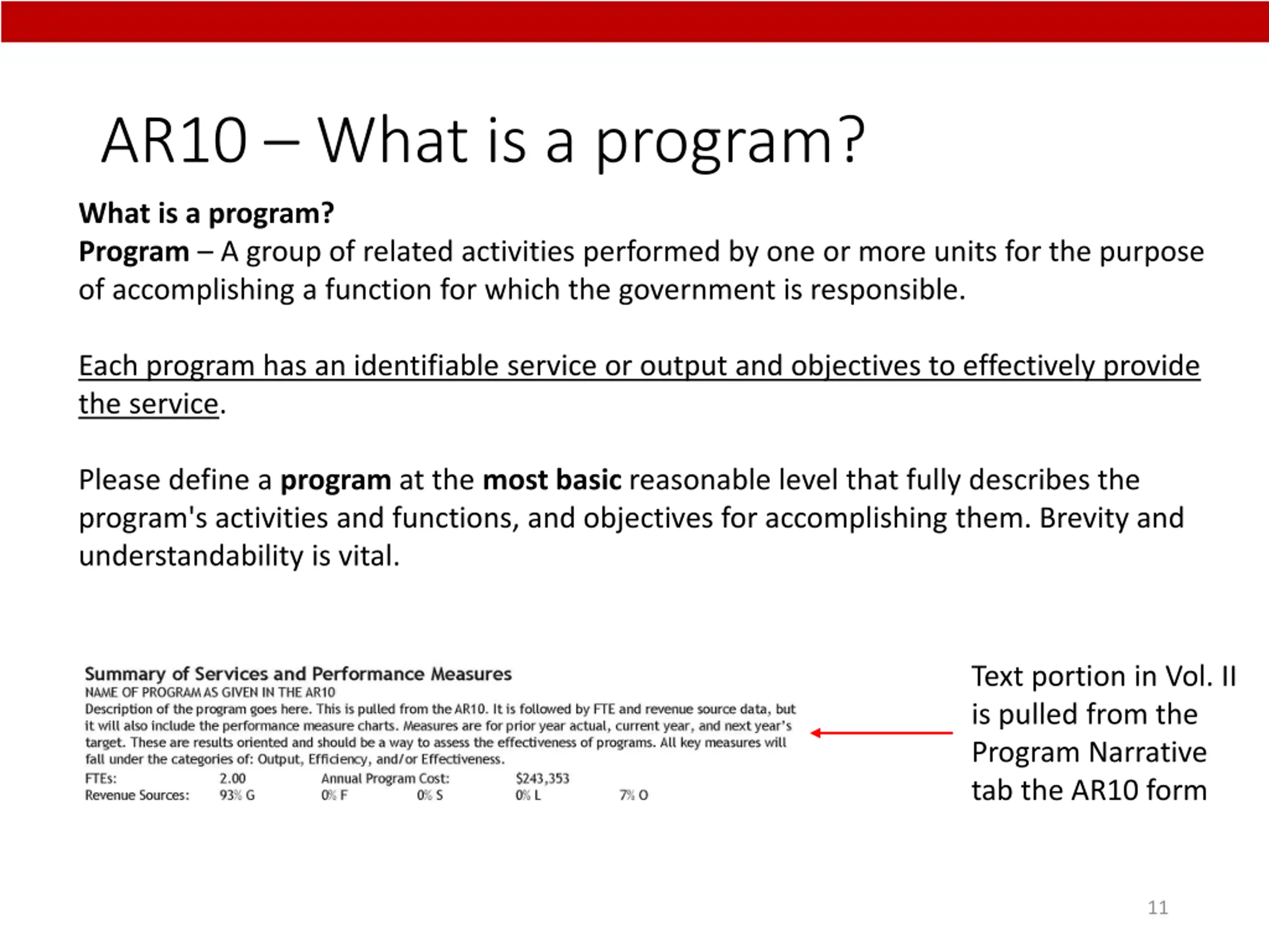 AR10 What is a program? What is a program? Program A group of related activities performed by one or more units for the purpose of accomplishing a function for which the government is responsible. Each program has an identifiable service or output and objectives to effectively provide the service. Please define a program at the most basic reasonable level that fully describes the program's activities and functions, and objectives for accomplishing them. Brevity and understandability is vital. Text portion in Vol. II is pulled from the Program Narrative tab the AR10 form 11