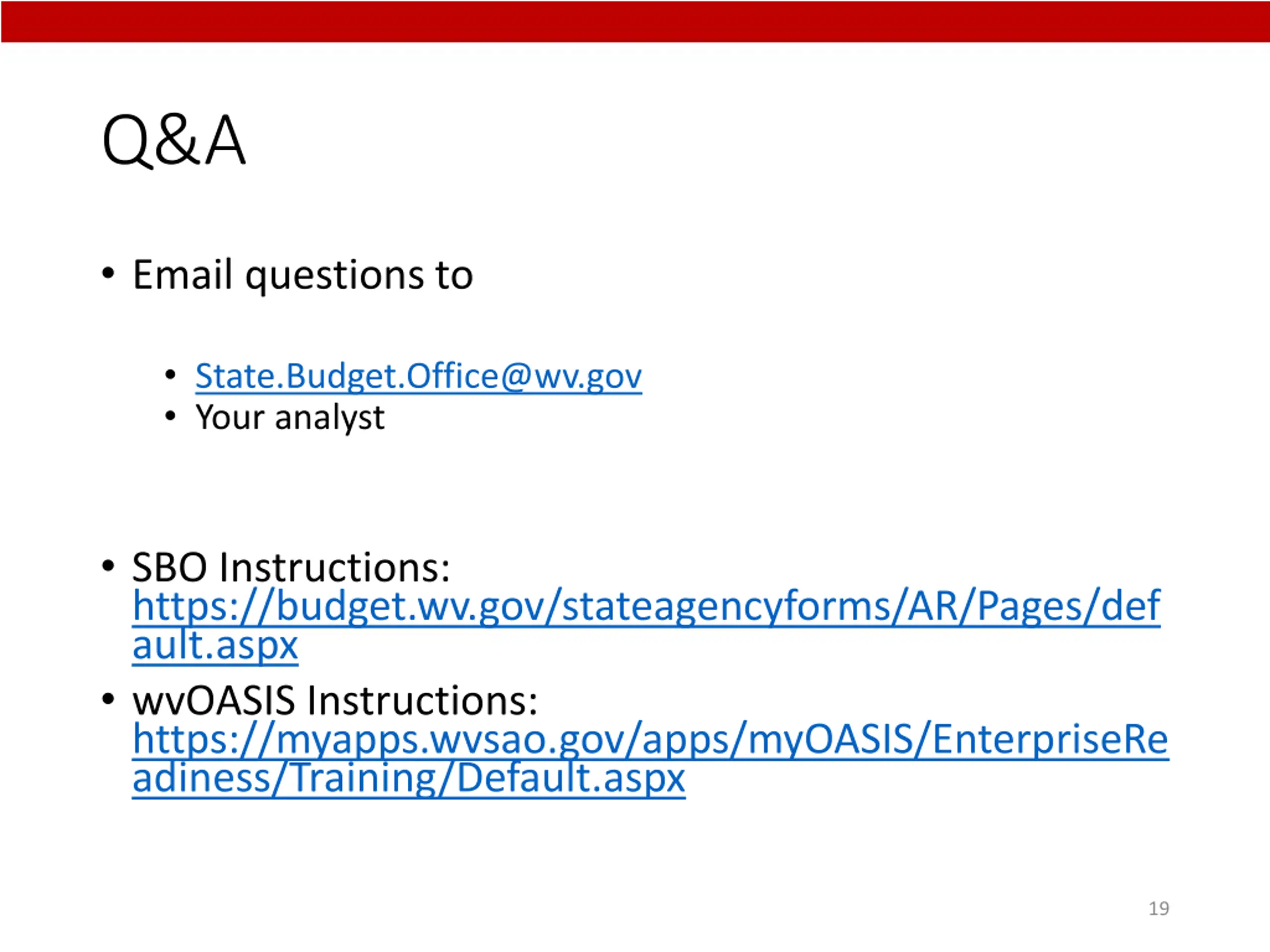 Q&A Email questions to State.Budget.Office@wv.gov Your analyst SBO Instructions: https://budget.wv.gov/stateagencyforms/AR/Pages/def ault.aspx wvOASIS Instructions: https://myapps.wvsao.gov/apps/myOASIS/EnterpriseRe adiness/Training/Default.aspx 19