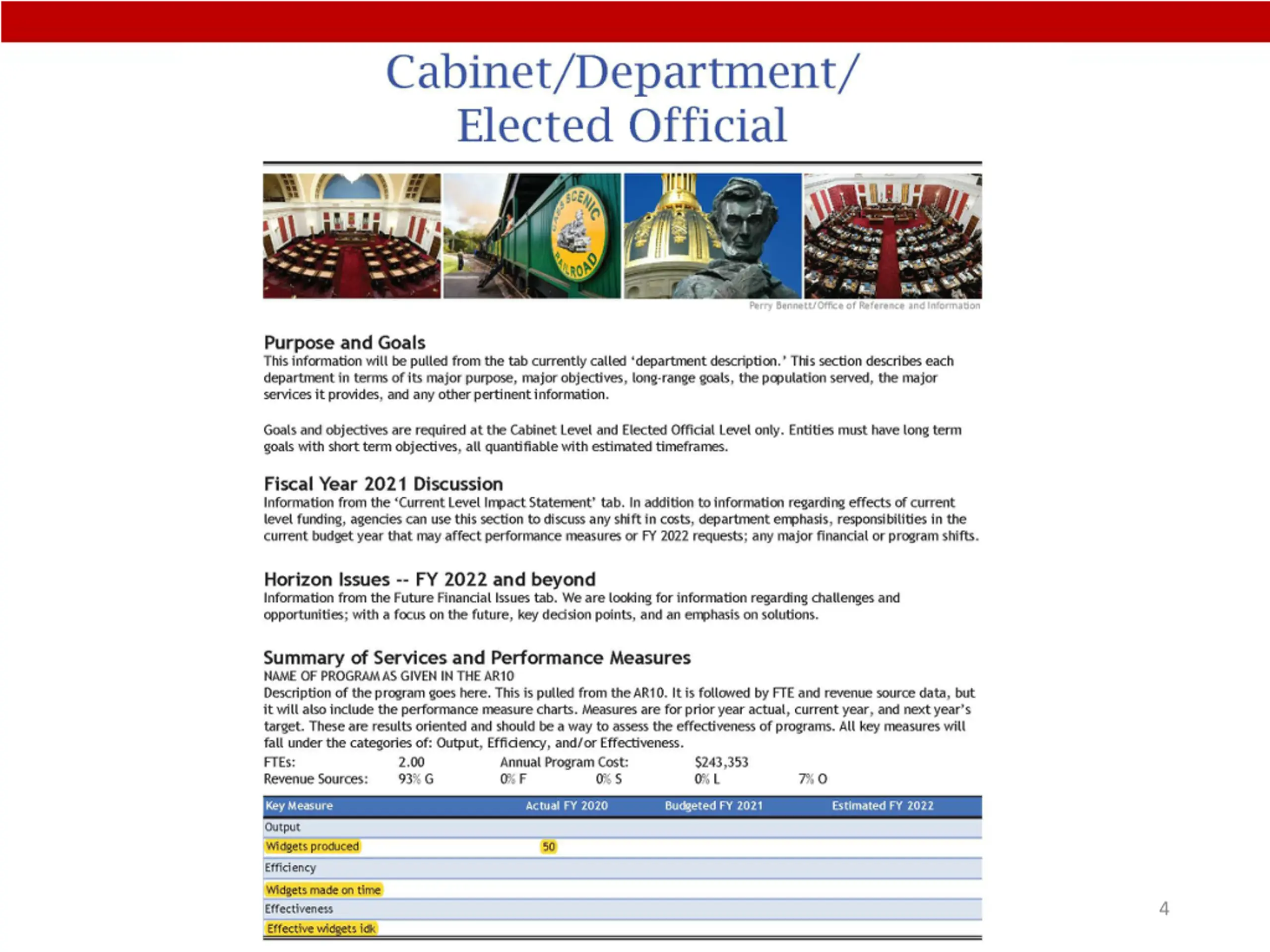 First three sections will pull from AR1 tabs in Budget Development This section will pull from narrative tab in AR10 New performance measure tab in AR10 5