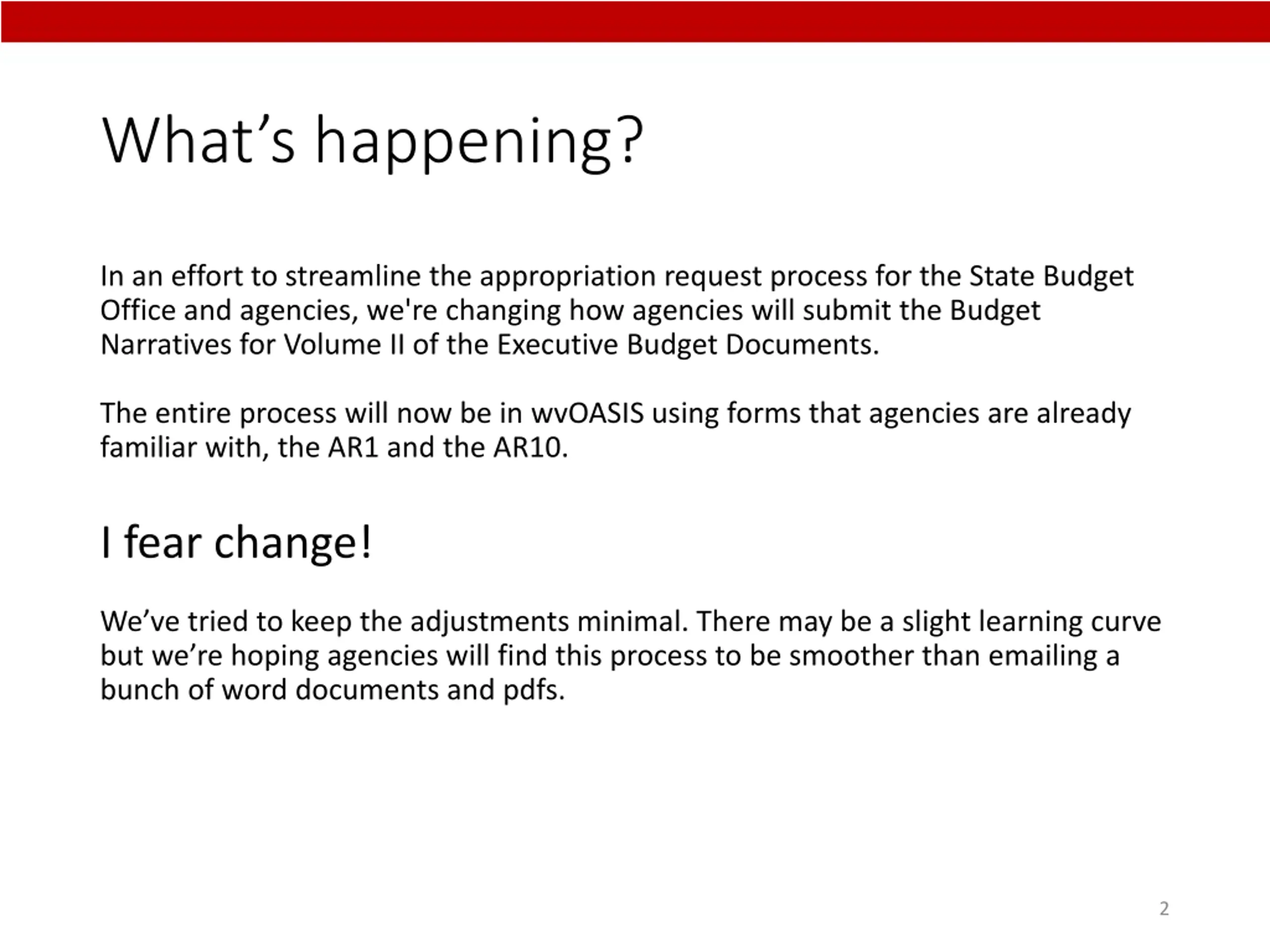 Whats happening? In an effort to streamline the appropriation request process for the State Budget Office and agencies, we're changing how agencies will submit the Budget Narratives for Volume II of the Executive Budget Documents. The entire process will now be in wvOASIS using forms that agencies are already familiar with, the AR1 and the AR10. I fear change! We ve tried to keep the adjustments minimal. There may be a slight learning curve but we re hoping agencies will find this process to be smoother than emailing a bunch of word documents and pdfs. 2