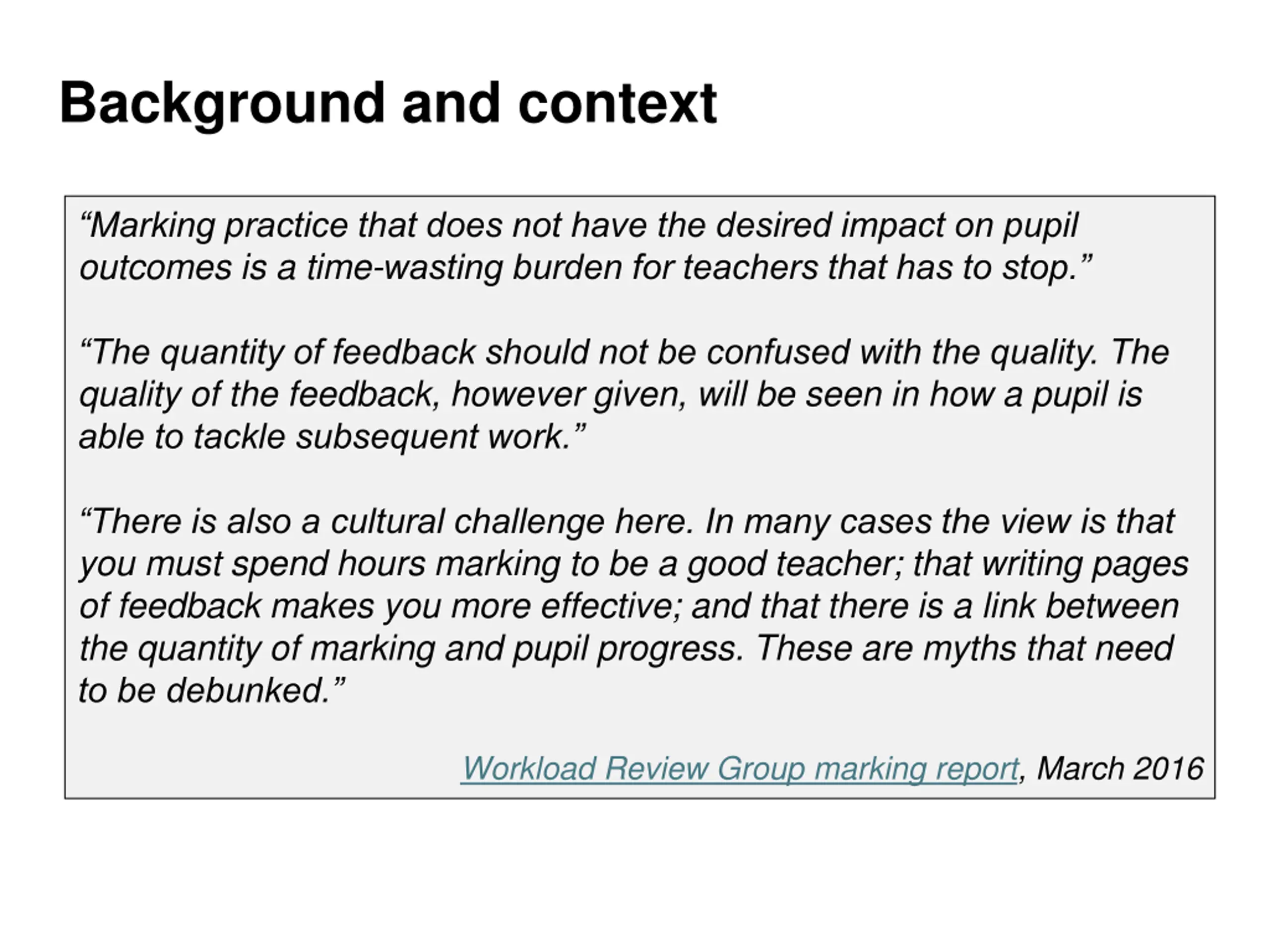 Background and context Marking practice that does not have the desired impact on pupil outcomes is a time-wasting burden for teachers that has to stop. The quantity of feedback should not be confused with the quality. The quality of the feedback, however given, will be seen in how a pupil is able to tackle subsequent work. There is also a cultural challenge here. In many cases the view is that you must spend hours marking to be a good teacher; that writing pages of feedback makes you more effective; and that there is a link between the quantity of marking and pupil progress. These are myths that need to be debunked. Workload Review Group marking report, March 2016