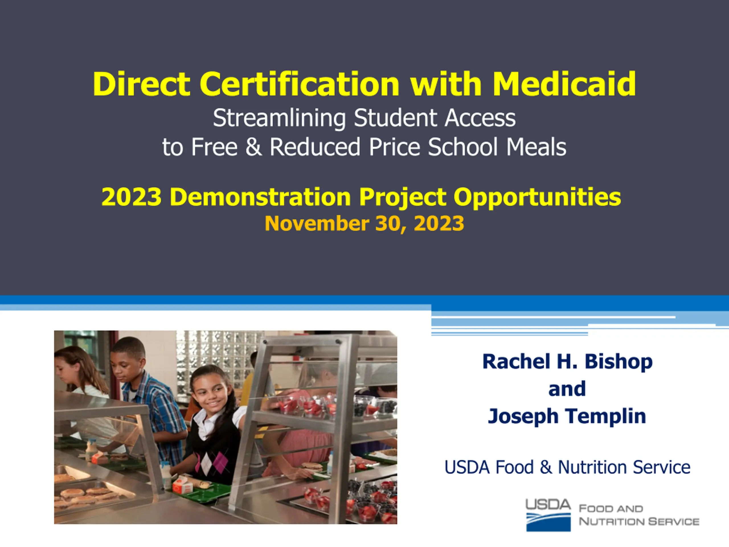 Direct Certification with Medicaid Streamlining Student Access to Free & Reduced Price School Meals 2023 Demonstration Project Opportunities November 30, 2023 Rachel H. Bishop and Joseph Templin USDA Food & Nutrition Service