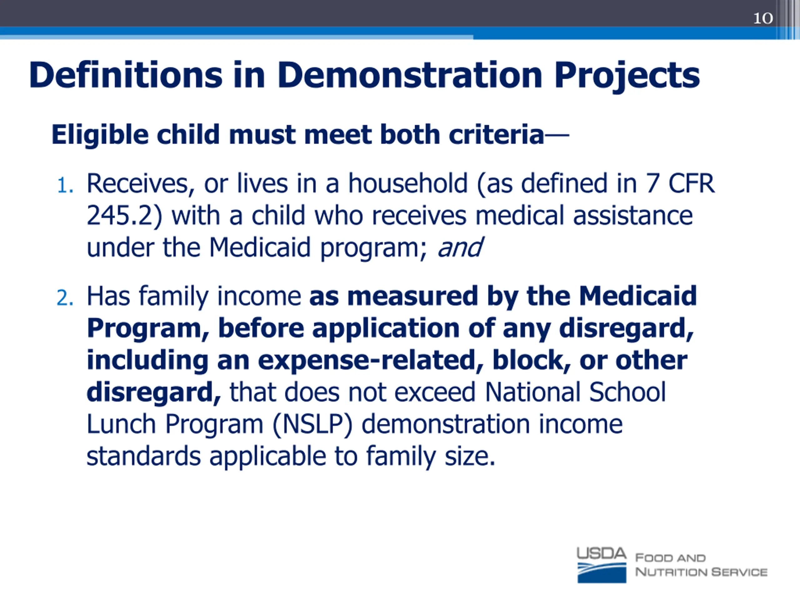 10 Definitions in Demonstration Projects Eligible child must meet both criteria 1. Receives, or lives in a household (as defined in 7 CFR 245.2) with a child who receives medical assistance under the Medicaid program; and 2. Has family income as measured by the Medicaid Program, before application of any disregard, including an expense-related, block, or other disregard, that does not exceed National School Lunch Program (NSLP) demonstration income standards applicable to family size.