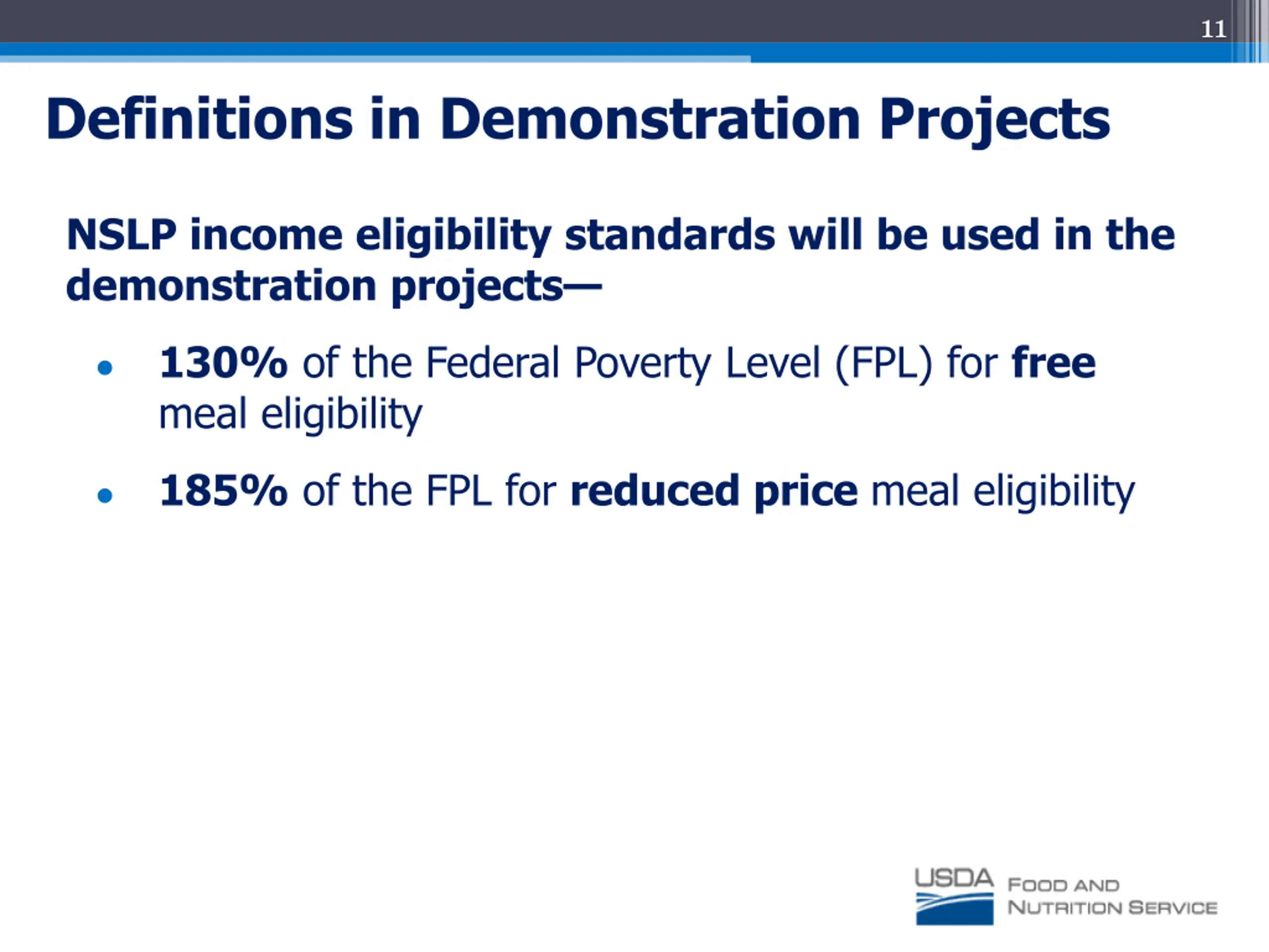 11 Definitions in Demonstration Projects NSLP income eligibility standards will be used in the demonstration projects 130% of the Federal Poverty Level (FPL) for free meal eligibility 185% of the FPL for reduced price meal eligibility