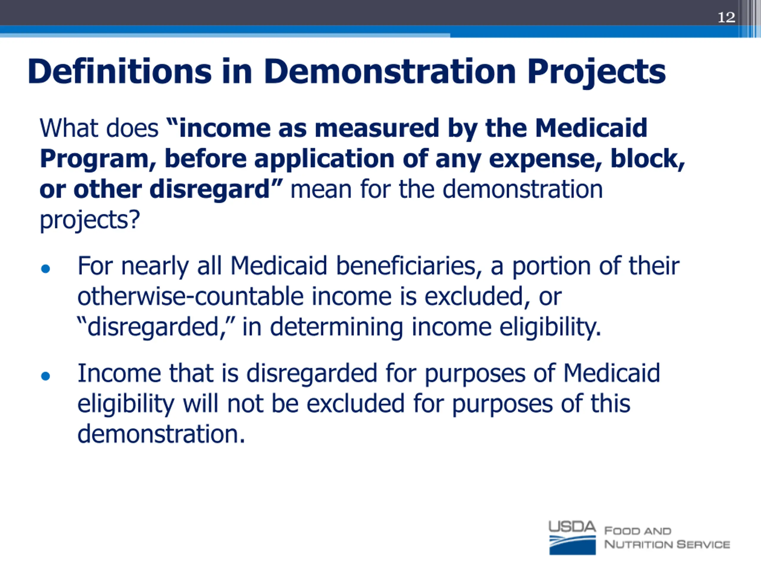 12 Definitions in Demonstration Projects What does income as measured by the Medicaid Program, before application of any expense, block, or other disregard mean for the demonstration projects? For nearly all Medicaid beneficiaries, a portion of their otherwise-countable income is excluded, or disregarded, in determining income eligibility. Income that is disregarded for purposes of Medicaid eligibility will not be excluded for purposes of this demonstration.