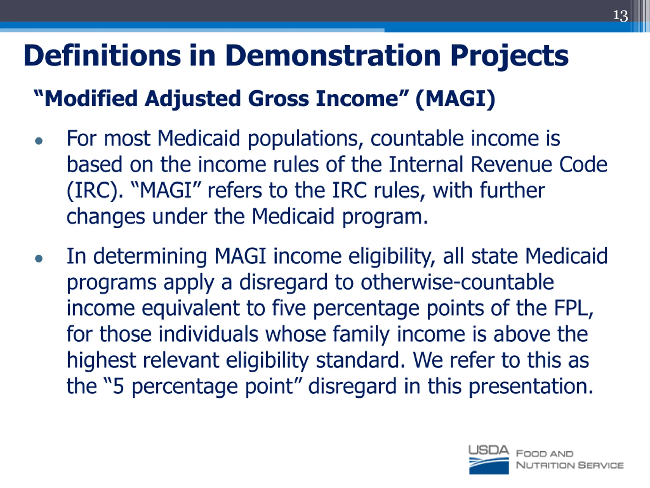 13 Definitions in Demonstration Projects Modified Adjusted Gross Income (MAGI) For most Medicaid populations, countable income is based on the income rules of the Internal Revenue Code (IRC). MAGI refers to the IRC rules, with further changes under the Medicaid program. In determining MAGI income eligibility, all state Medicaid programs apply a disregard to otherwise-countable income equivalent to five percentage points of the FPL, for those individuals whose family income is above the highest relevant eligibility standard. We refer to this as the 5 percentage point disregard in this presentation.