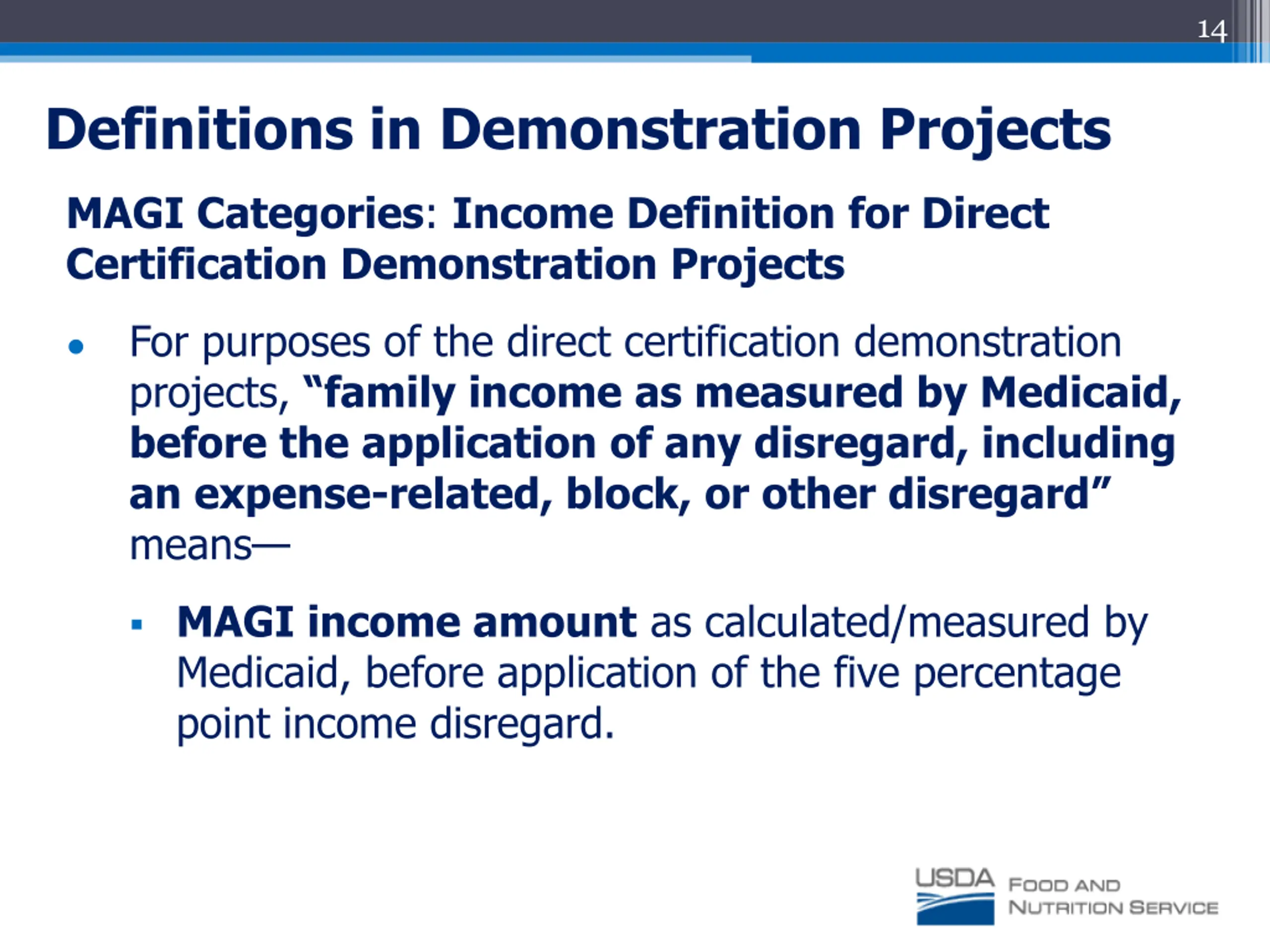 14 Definitions in Demonstration Projects MAGI Categories: Income Definition for Direct Certification Demonstration Projects For purposes of the direct certification demonstration projects, family income as measured by Medicaid, before the application of any disregard, including an expense-related, block, or other disregard means MAGI income amount as calculated/measured by Medicaid, before application of the five percentage point income disregard.