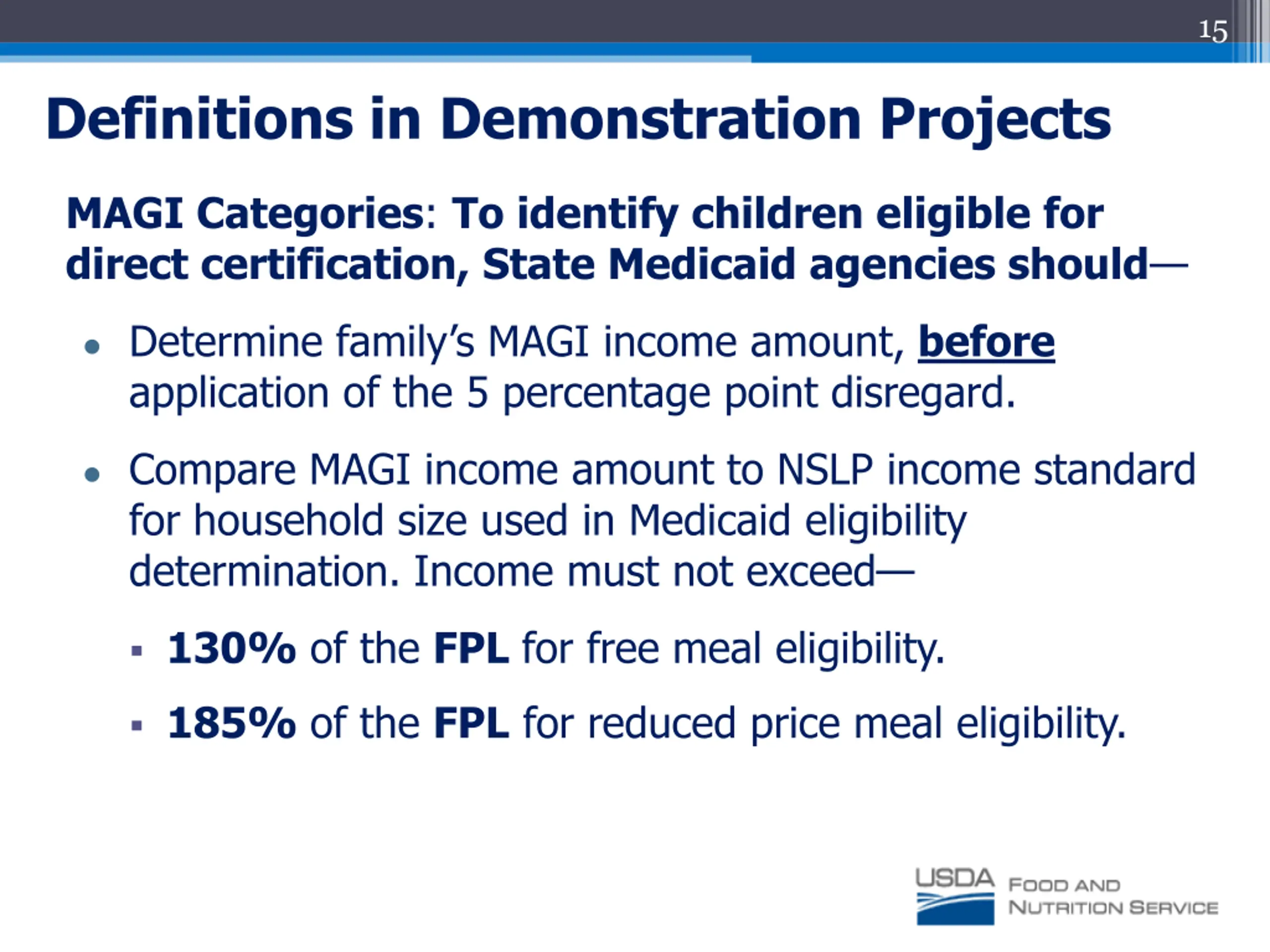 15 Definitions in Demonstration Projects MAGI Categories: To identify children eligible for direct certification, State Medicaid agencies should Determine family s MAGI income amount, before application of the 5 percentage point disregard. Compare MAGI income amount to NSLP income standard for household size used in Medicaid eligibility determination. Income must not exceed 130% of the FPL for free meal eligibility. 185% of the FPL for reduced price meal eligibility.