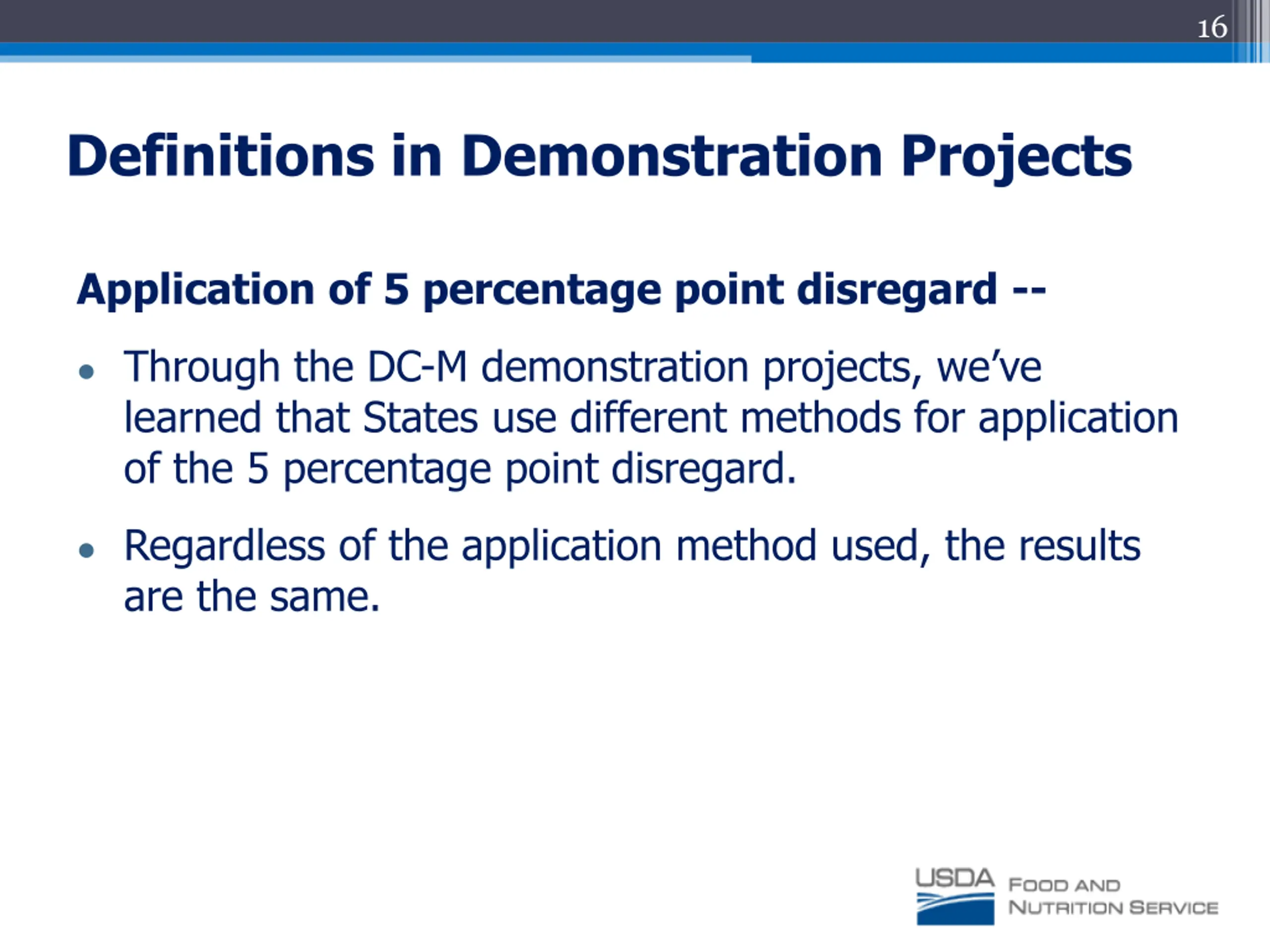 16 Definitions in Demonstration Projects Application of 5 percentage point disregard -- Through the DC-M demonstration projects, we ve learned that States use different methods for application of the 5 percentage point disregard. Regardless of the application method used, the results are the same.