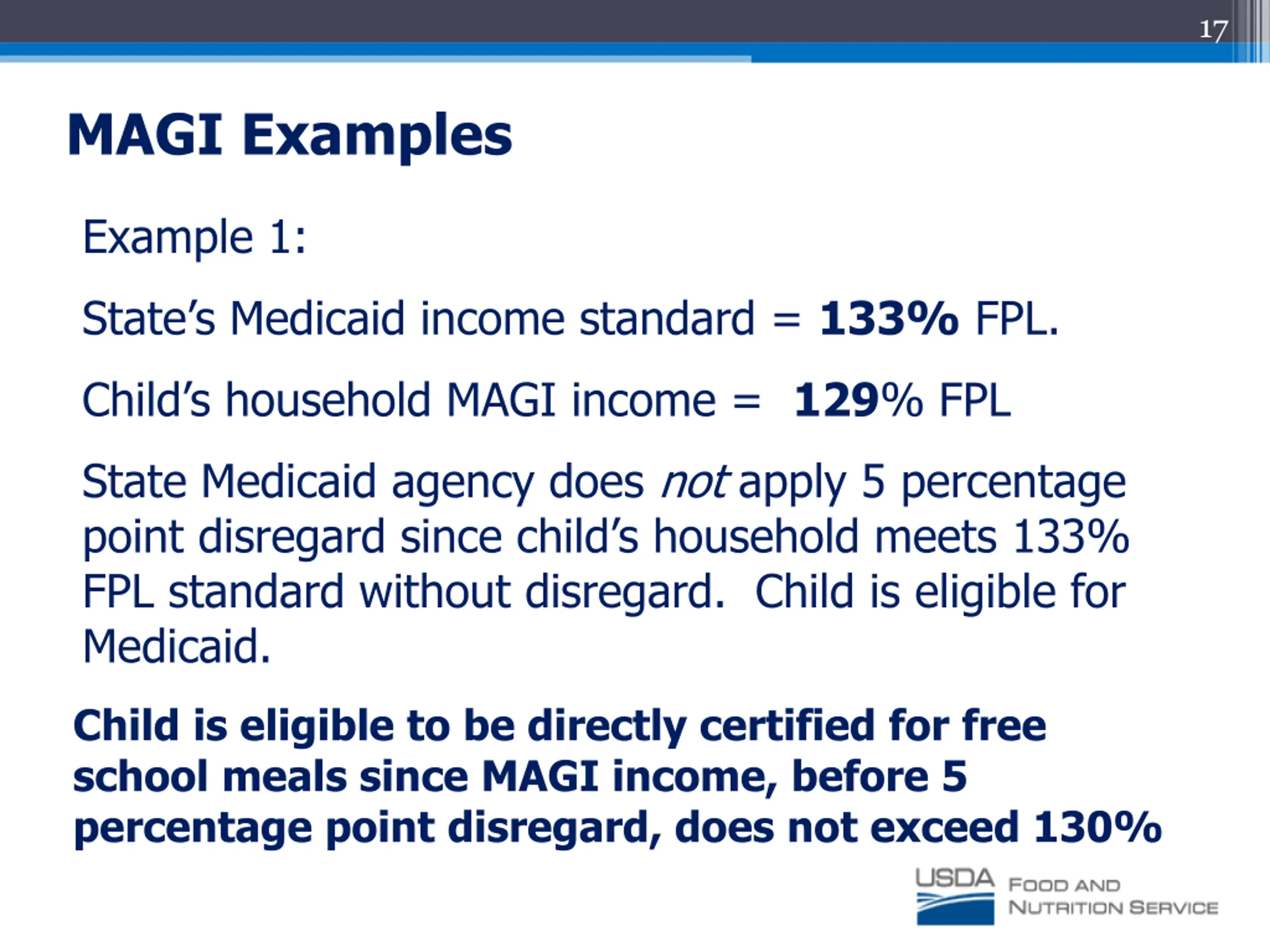 18 MAGI Examples Example 2: State s Medicaid income standard = 133% FPL Child s household MAGI income = 134% FPL. State Medicaid agency applies 5 percentage point disregard which reduces household income to an effective 129 percent FPL, so child is eligible for Medicaid. Child is not eligible to be directly certified for free school meals since MAGI income, before 5 percentage point disregard, is over 130% FPL. Child is eligible for reduced price meals, since MAGI income does not exceed 185% FPL