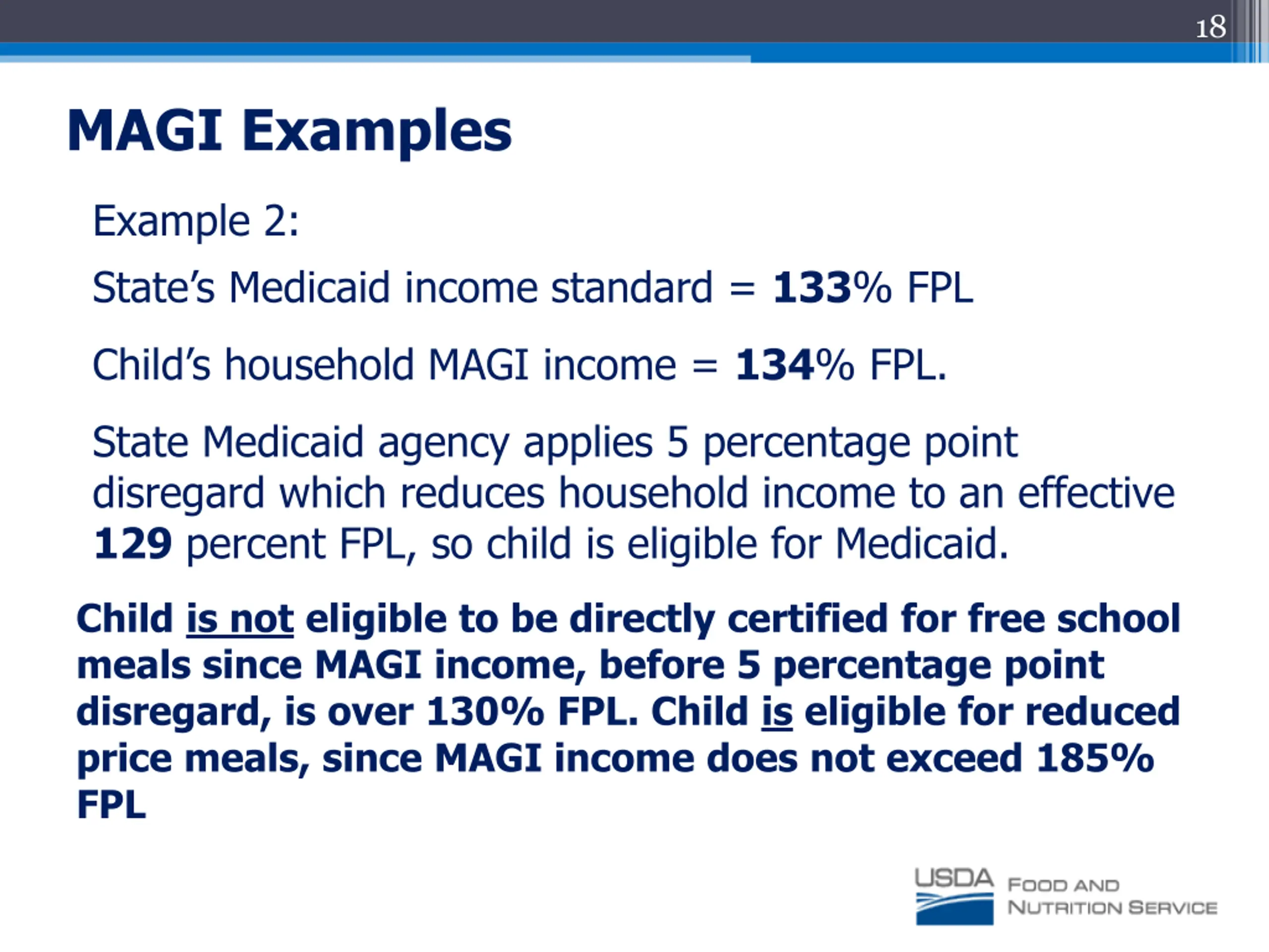 17 MAGI Examples Example 1: State s Medicaid income standard = 133% FPL. Child s household MAGI income = 129% FPL State Medicaid agency does not apply 5 percentage point disregard since child s household meets 133% FPL standard without disregard. Child is eligible for Medicaid. Child is eligible to be directly certified for free school meals since MAGI income, before 5 percentage point disregard, does not exceed 130%