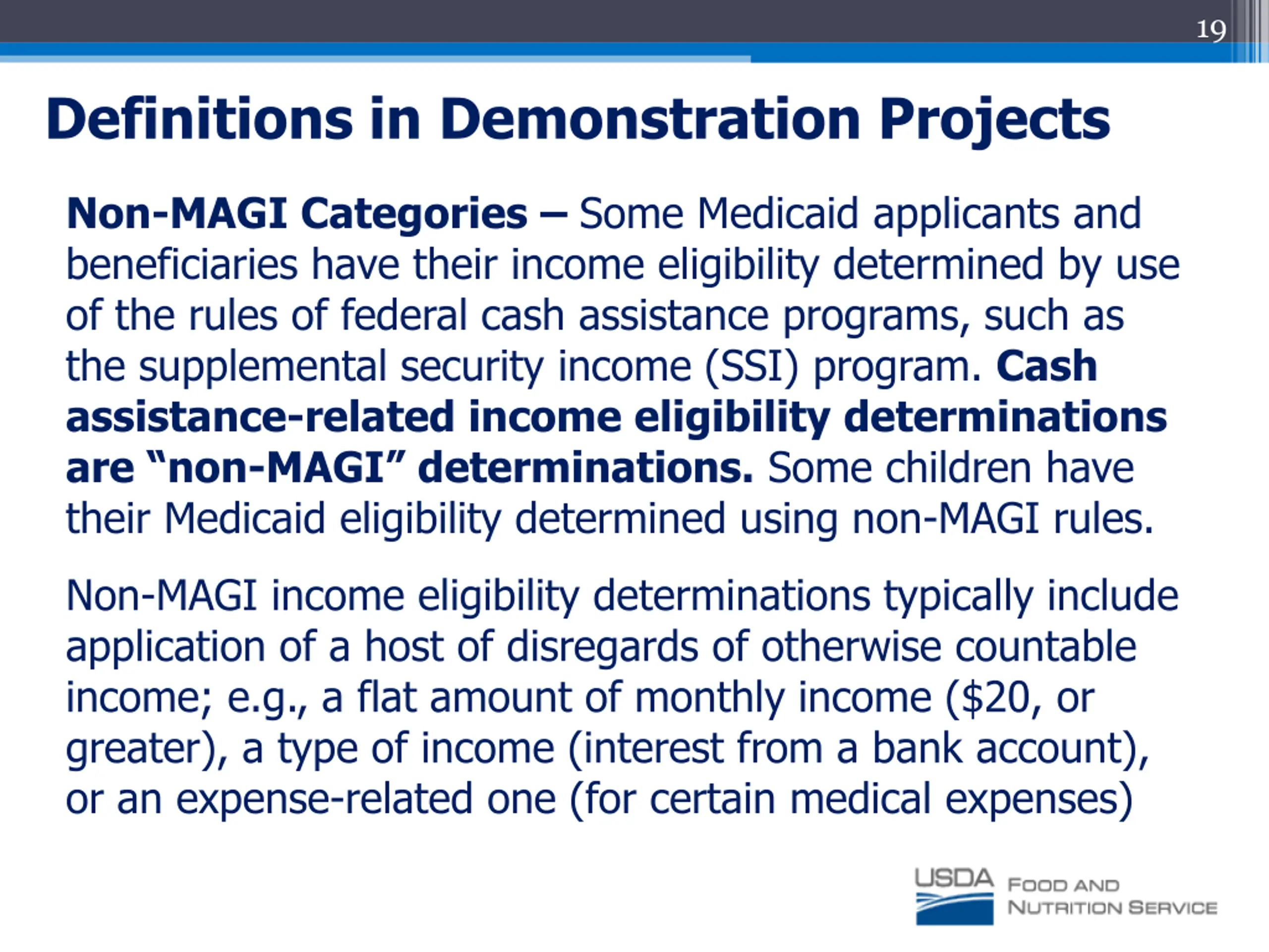 19 Definitions in Demonstration Projects Non-MAGI Categories Some Medicaid applicants and beneficiaries have their income eligibility determined by use of the rules of federal cash assistance programs, such as the supplemental security income (SSI) program. Cash assistance-related income eligibility determinations are non-MAGI determinations. Some children have their Medicaid eligibility determined using non-MAGI rules. Non-MAGI income eligibility determinations typically include application of a host of disregards of otherwise countable income; e.g., a flat amount of monthly income ($20, or greater), a type of income (interest from a bank account), or an expense-related one (for certain medical expenses)