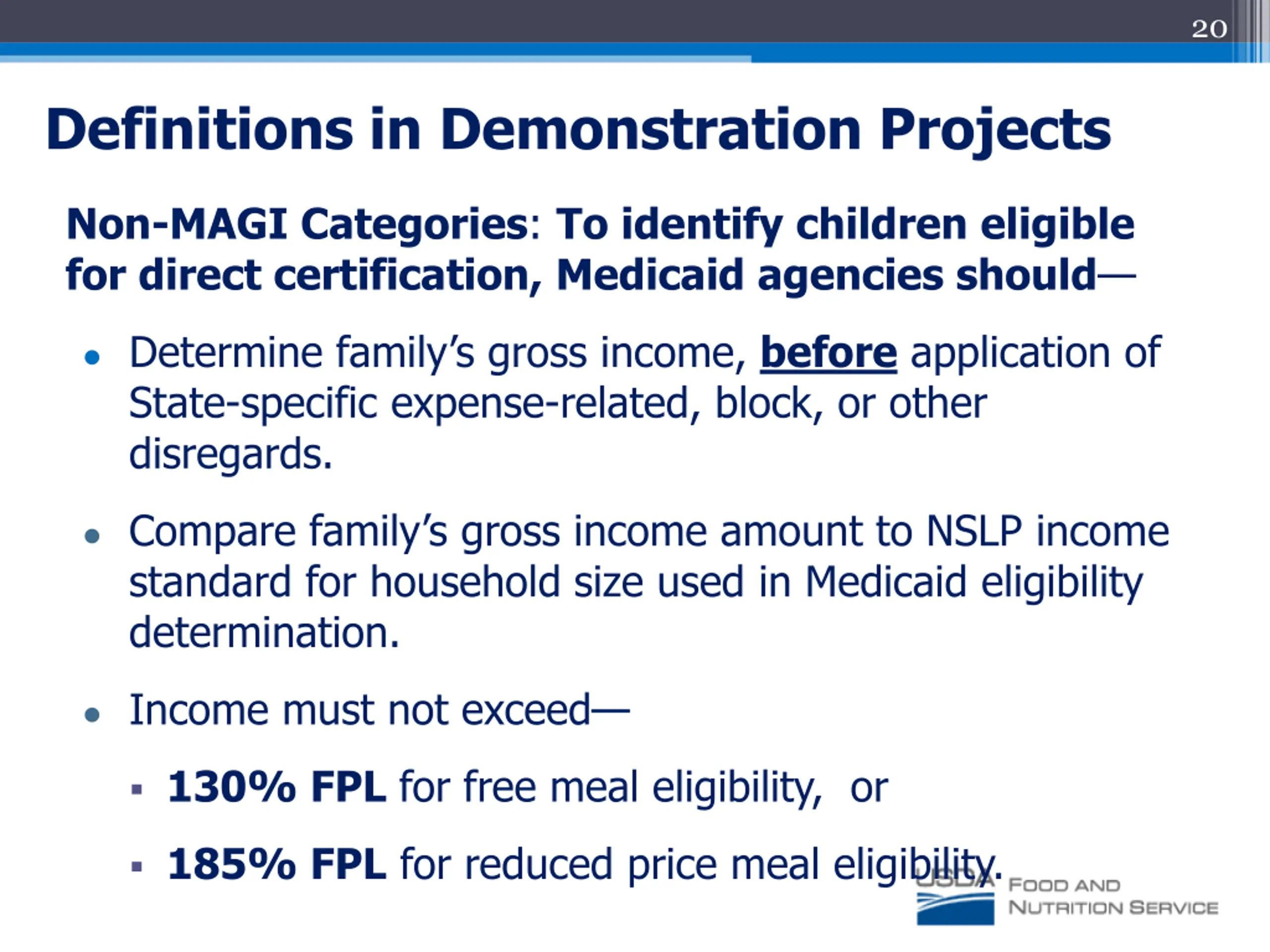 20 Definitions in Demonstration Projects Non-MAGI Categories: To identify children eligible for direct certification, Medicaid agencies should Determine family s gross income, before application of State-specific expense-related, block, or other disregards. Compare family s gross income amount to NSLP income standard for household size used in Medicaid eligibility determination. Income must not exceed 130% FPL for free meal eligibility, or 185% FPL for reduced price meal eligibility.