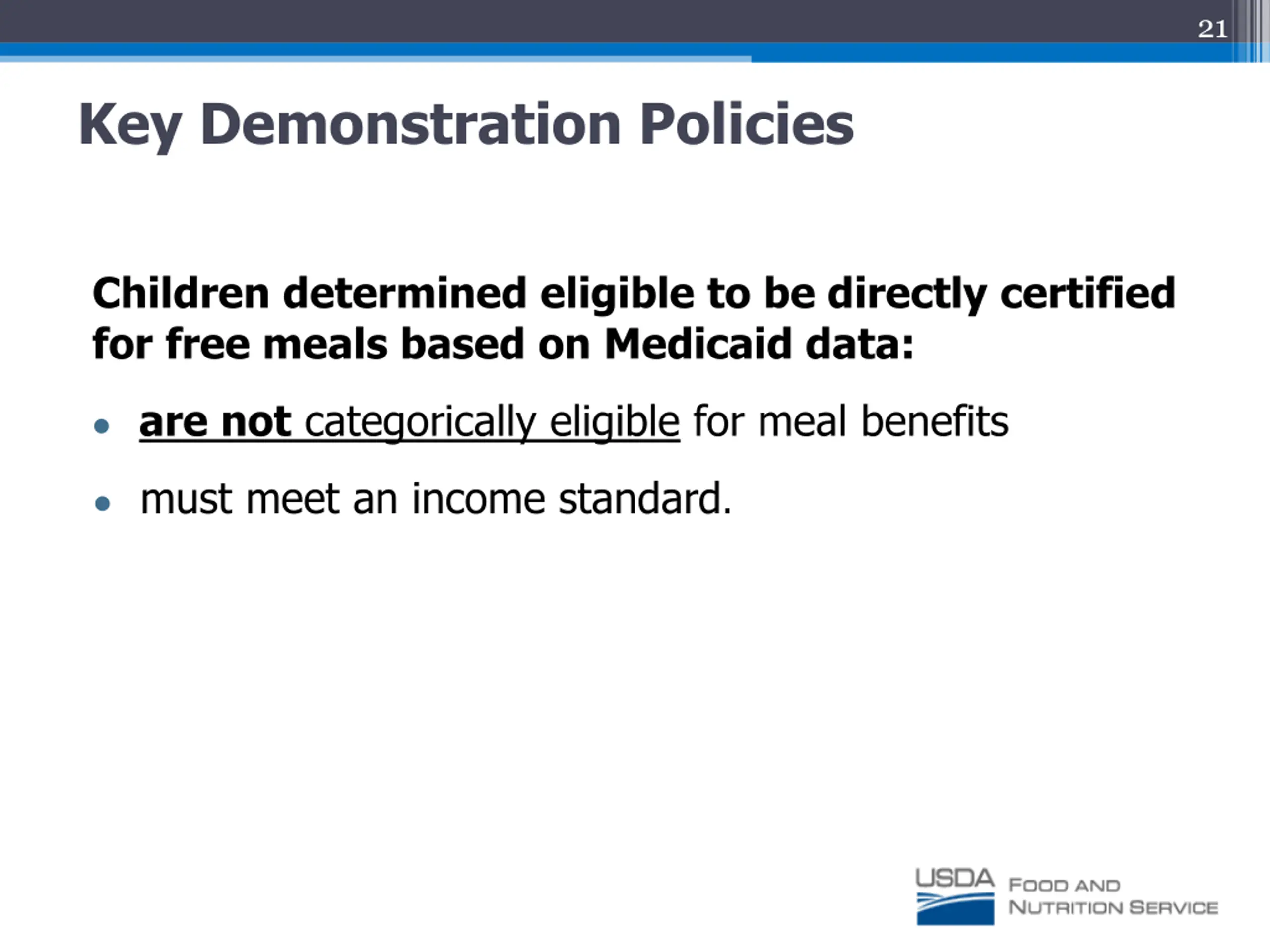 21 Key Demonstration Policies Children determined eligible to be directly certified for free meals based on Medicaid data: are not categorically eligible for meal benefits must meet an income standard.