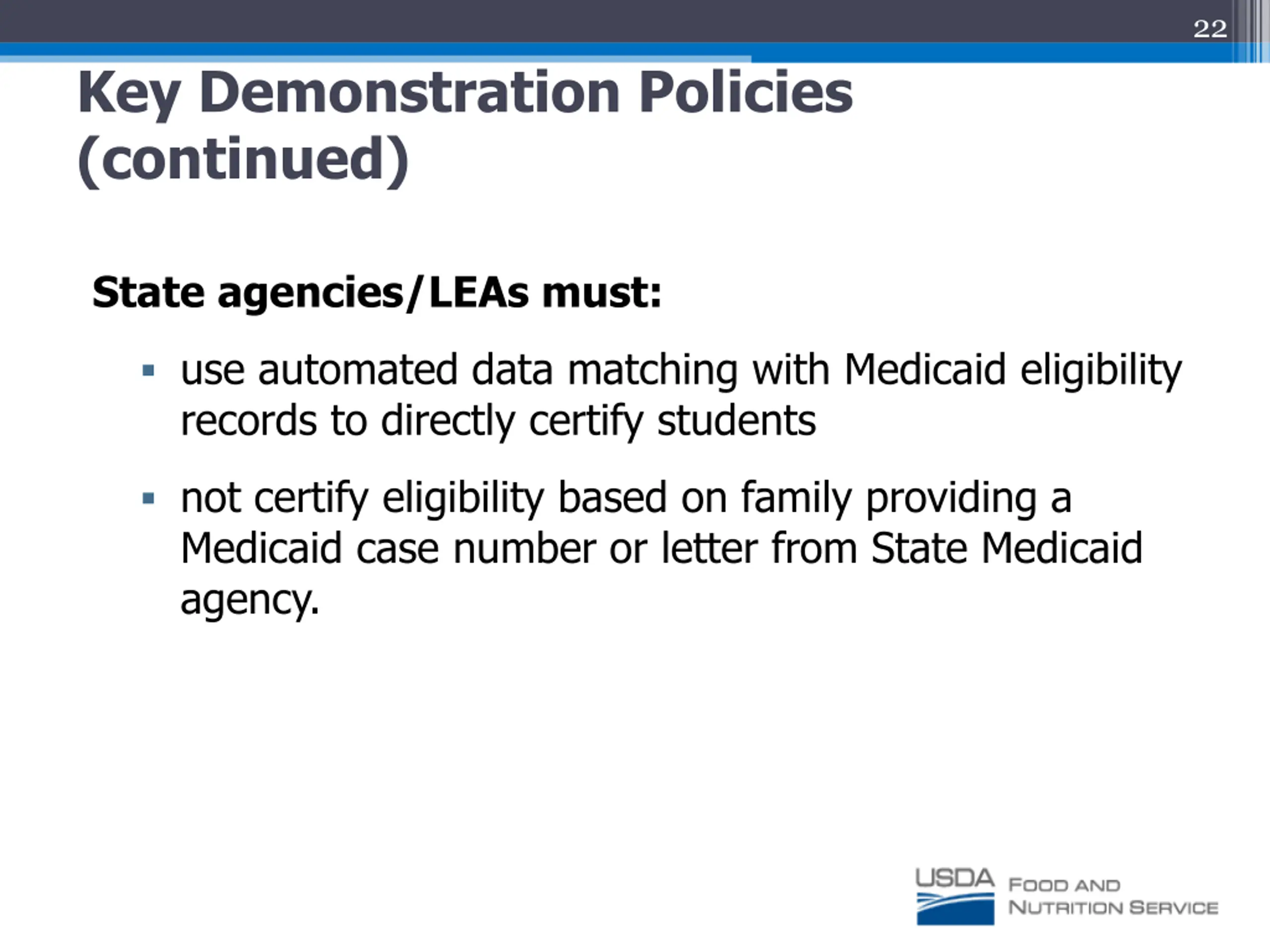 22 Key Demonstration Policies (continued) State agencies/LEAs must: use automated data matching with Medicaid eligibility records to directly certify students not certify eligibility based on family providing a Medicaid case number or letter from State Medicaid agency.
