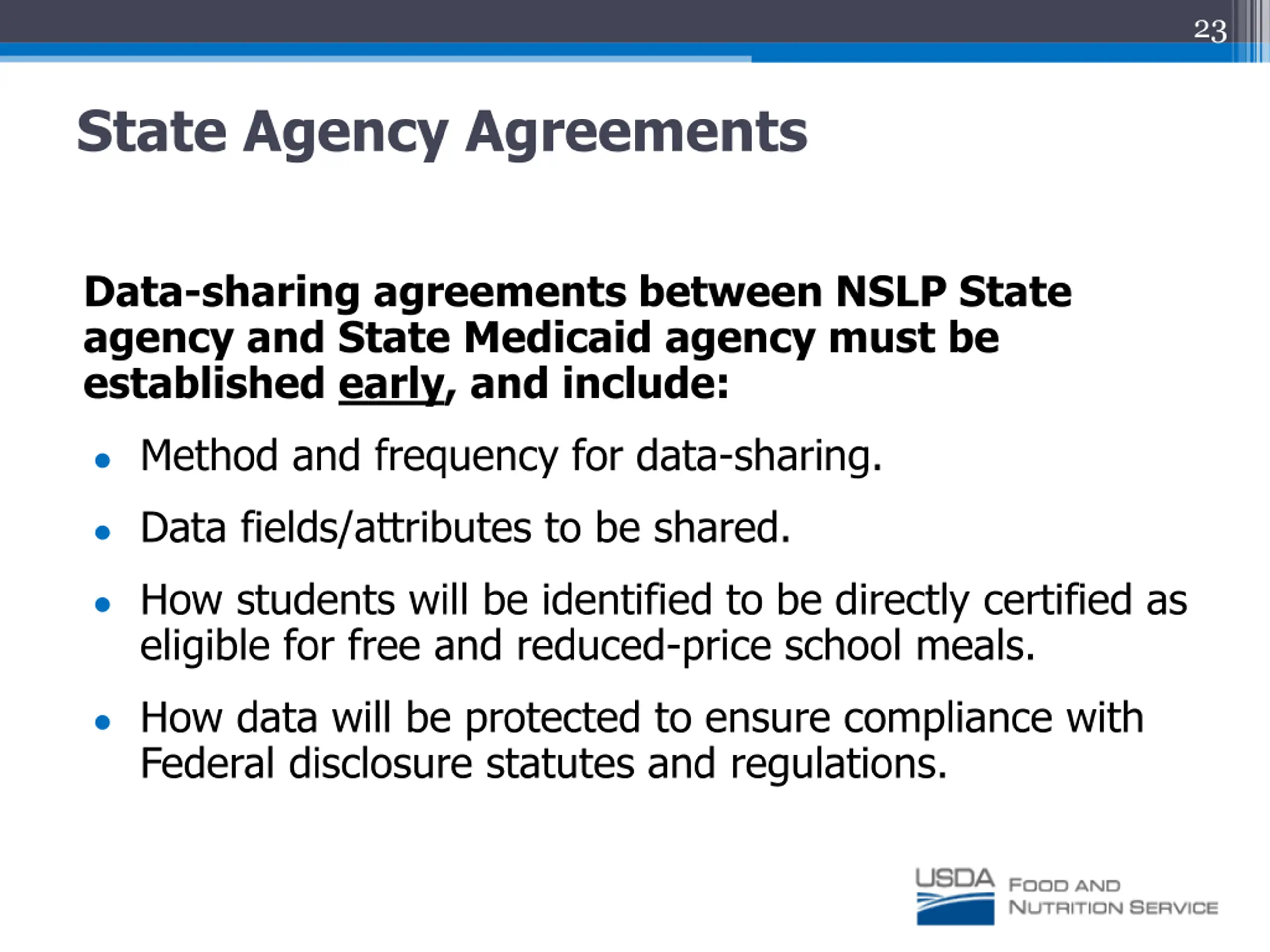23 State Agency Agreements Data-sharing agreements between NSLP State agency and State Medicaid agency must be established early, and include: Method and frequency for data-sharing. Data fields/attributes to be shared. How students will be identified to be directly certified as eligible for free and reduced-price school meals. How data will be protected to ensure compliance with Federal disclosure statutes and regulations.