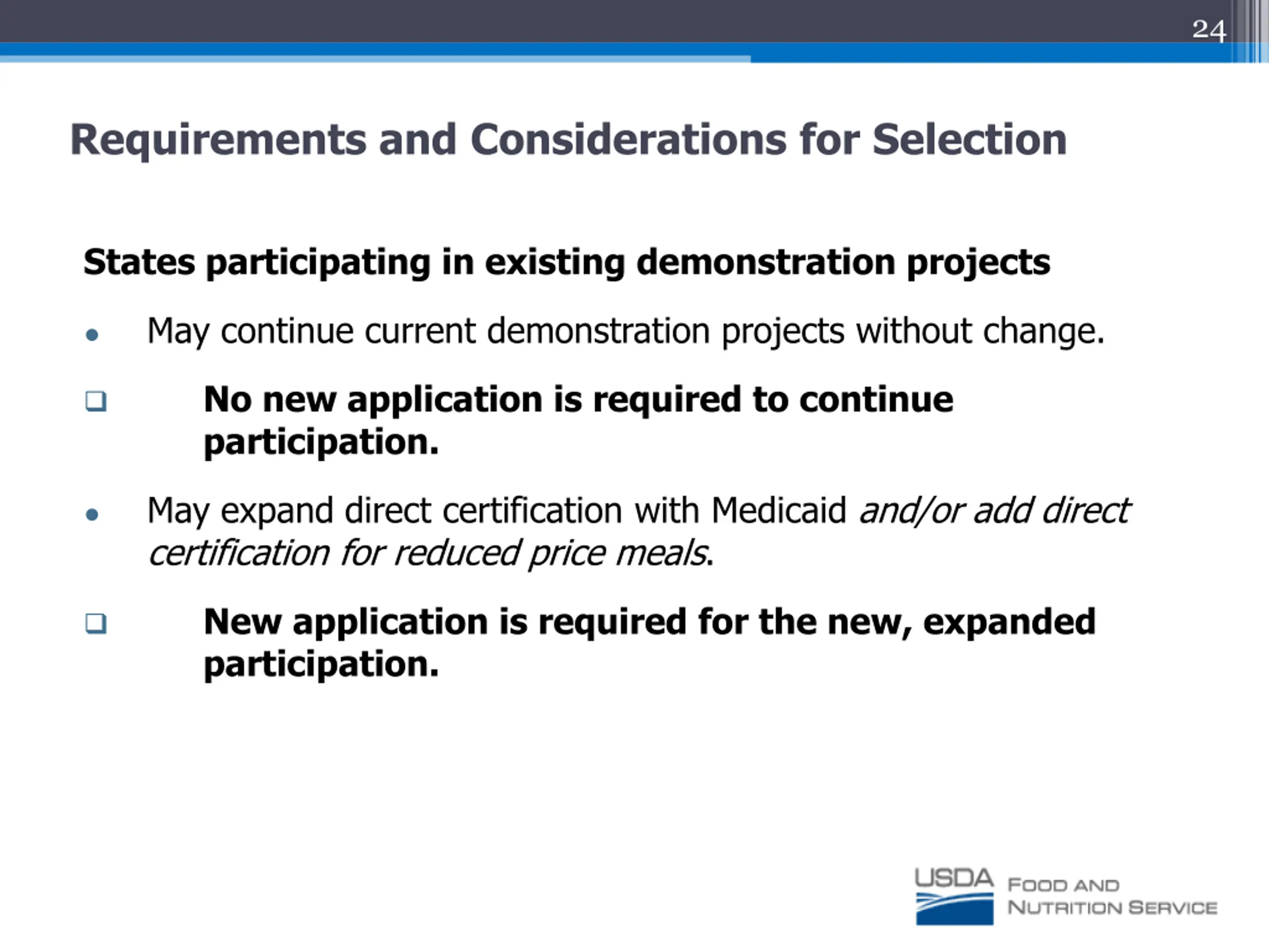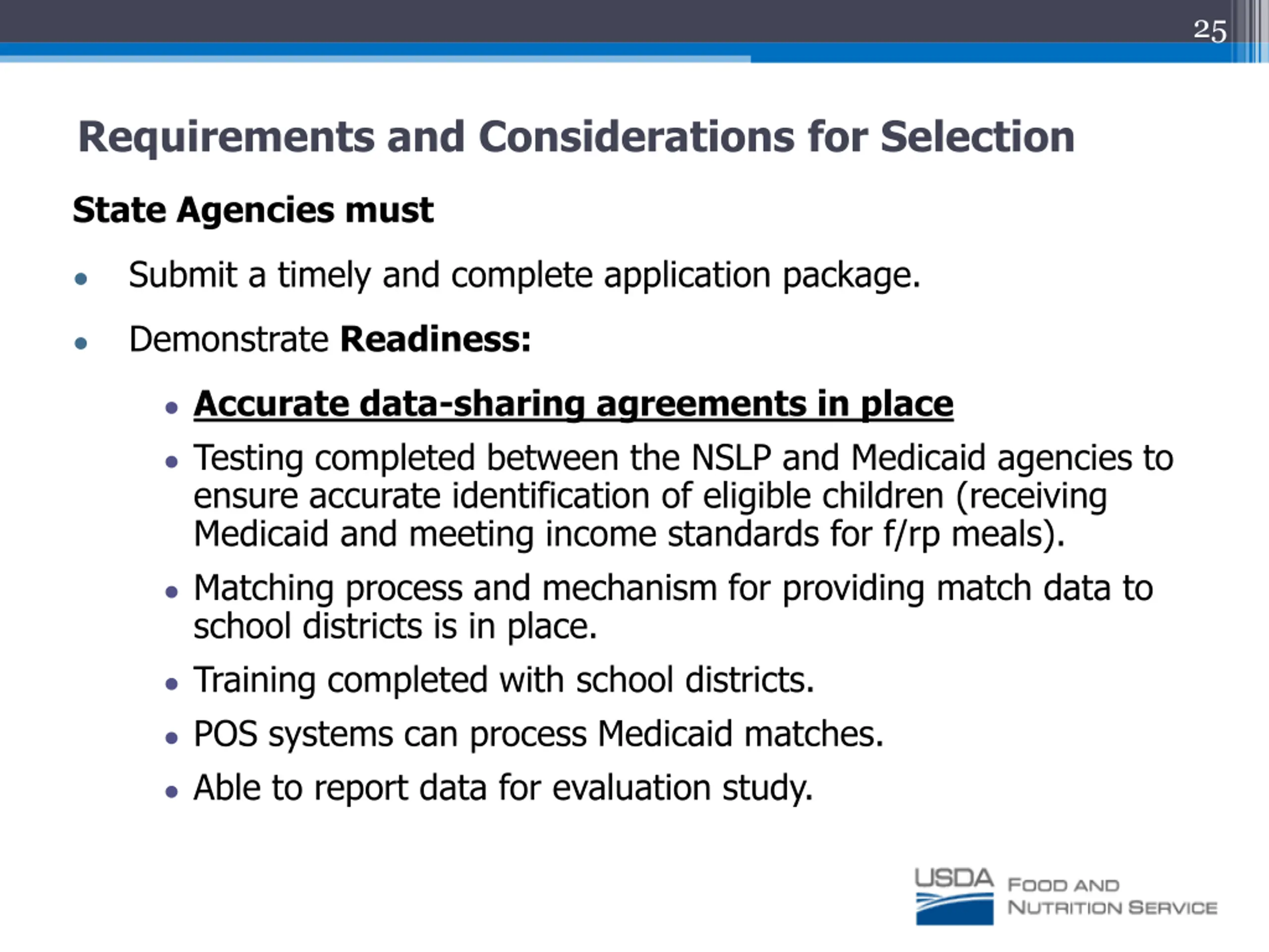 24 Requirements and Considerations for Selection States participating in existing demonstration projects May continue current demonstration projects without change. No new application is required to continue participation. May expand direct certification with Medicaid and/or add direct certification for reduced price meals. New application is required for the new, expanded participation.