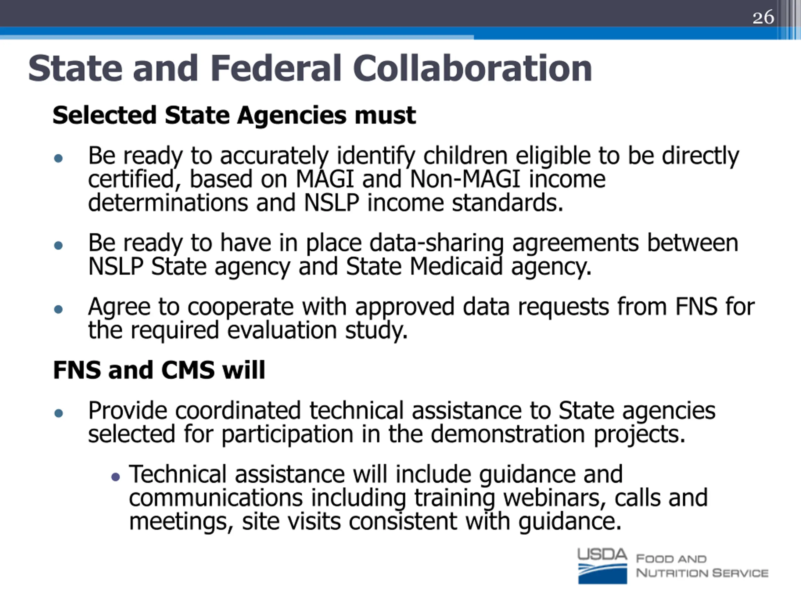 25 Requirements and Considerations for Selection State Agencies must Submit a timely and complete application package. Demonstrate Readiness: Accurate data-sharing agreements in place Testing completed between the NSLP and Medicaid agencies to ensure accurate identification of eligible children (receiving Medicaid and meeting income standards for f/rp meals). Matching process and mechanism for providing match data to school districts is in place. Training completed with school districts. POS systems can process Medicaid matches. Able to report data for evaluation study.