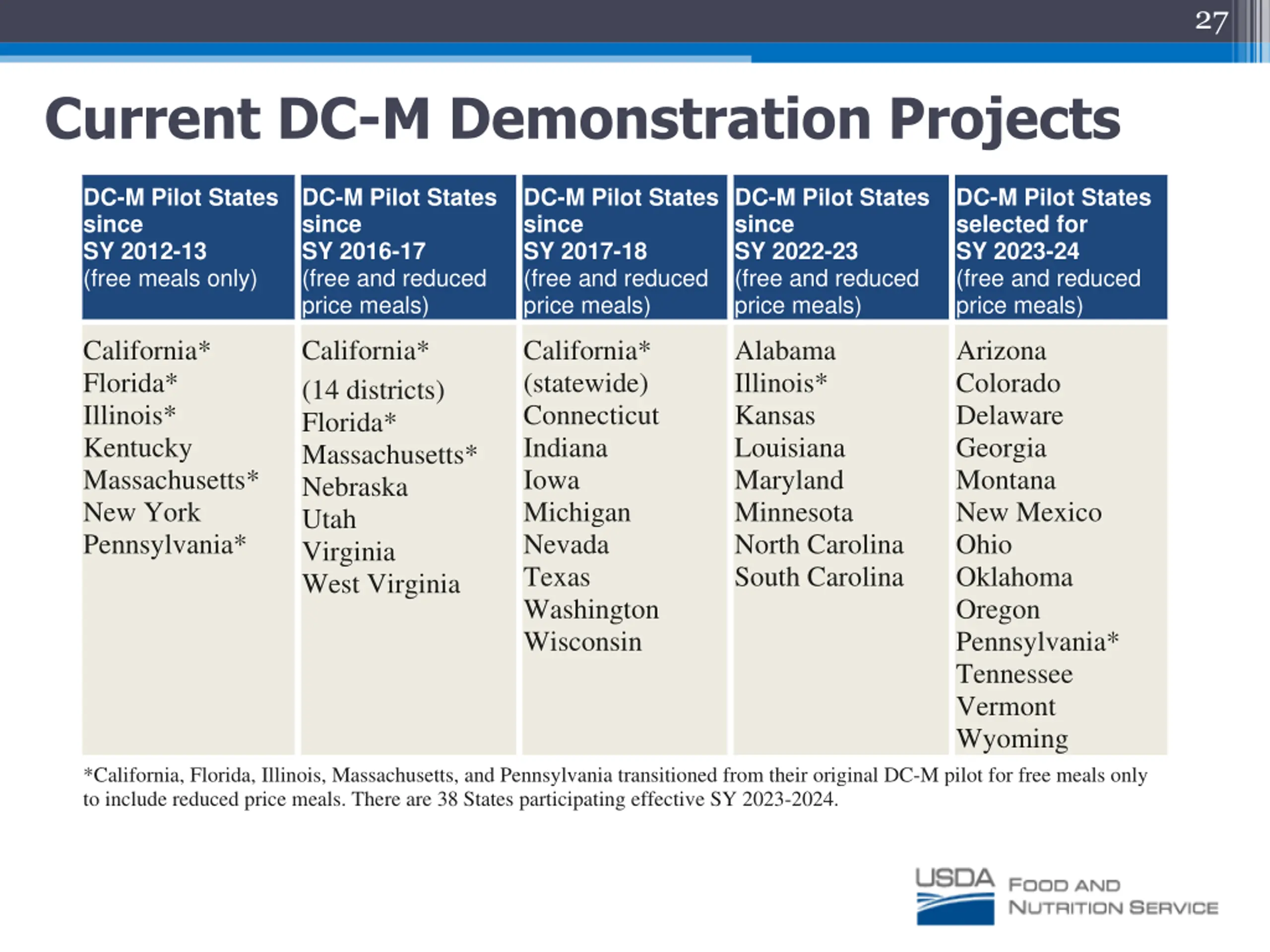 27 Current DC-M Demonstration Projects DC-M Pilot States since SY 2012-13 (free meals only) DC-M Pilot States since SY 2016-17 (free and reduced price meals) DC-M Pilot States since SY 2017-18 (free and reduced price meals) DC-M Pilot States since SY 2022-23 (free and reduced price meals) DC-M Pilot States selected for SY 2023-24 (free and reduced price meals) California* Florida* Illinois* Kentucky Massachusetts* New York Pennsylvania* California* (14 districts) Florida* Massachusetts* Nebraska Utah Virginia West Virginia California* (statewide) Connecticut Indiana Iowa Michigan Nevada Texas Washington Wisconsin Alabama Illinois* Kansas Louisiana Maryland Minnesota North Carolina South Carolina Arizona Colorado Delaware Georgia Montana New Mexico Ohio Oklahoma Oregon Pennsylvania* Tennessee Vermont Wyoming *California, Florida, Illinois, Massachusetts, and Pennsylvania transitioned from their original DC-M pilot for free meals only to include reduced price meals. There are 38 States participating effective SY 2023-2024.