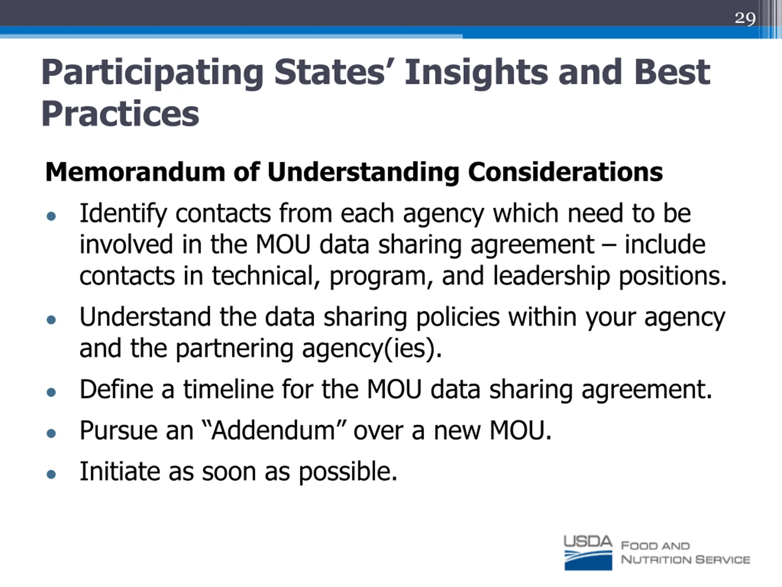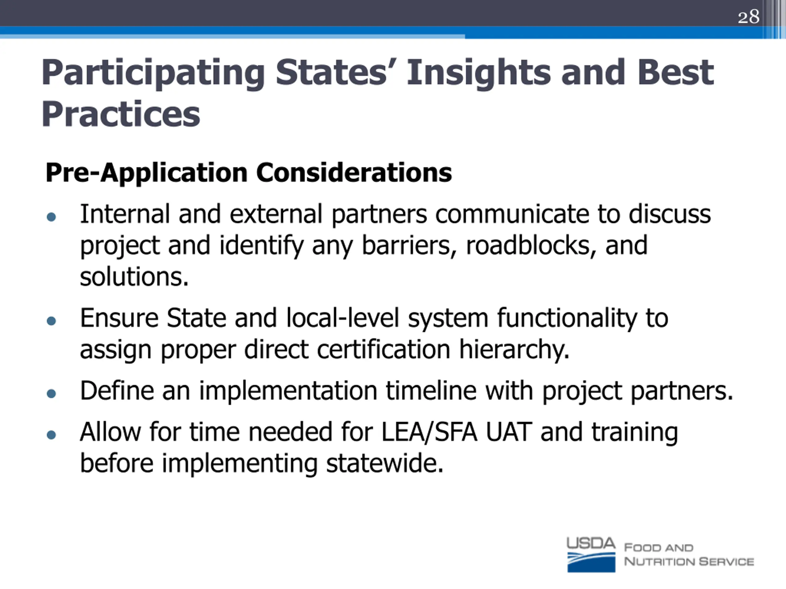 28 Participating States Insights and Best Practices Pre-Application Considerations Internal and external partners communicate to discuss project and identify any barriers, roadblocks, and solutions. Ensure State and local-level system functionality to assign proper direct certification hierarchy. Define an implementation timeline with project partners. Allow for time needed for LEA/SFA UAT and training before implementing statewide.