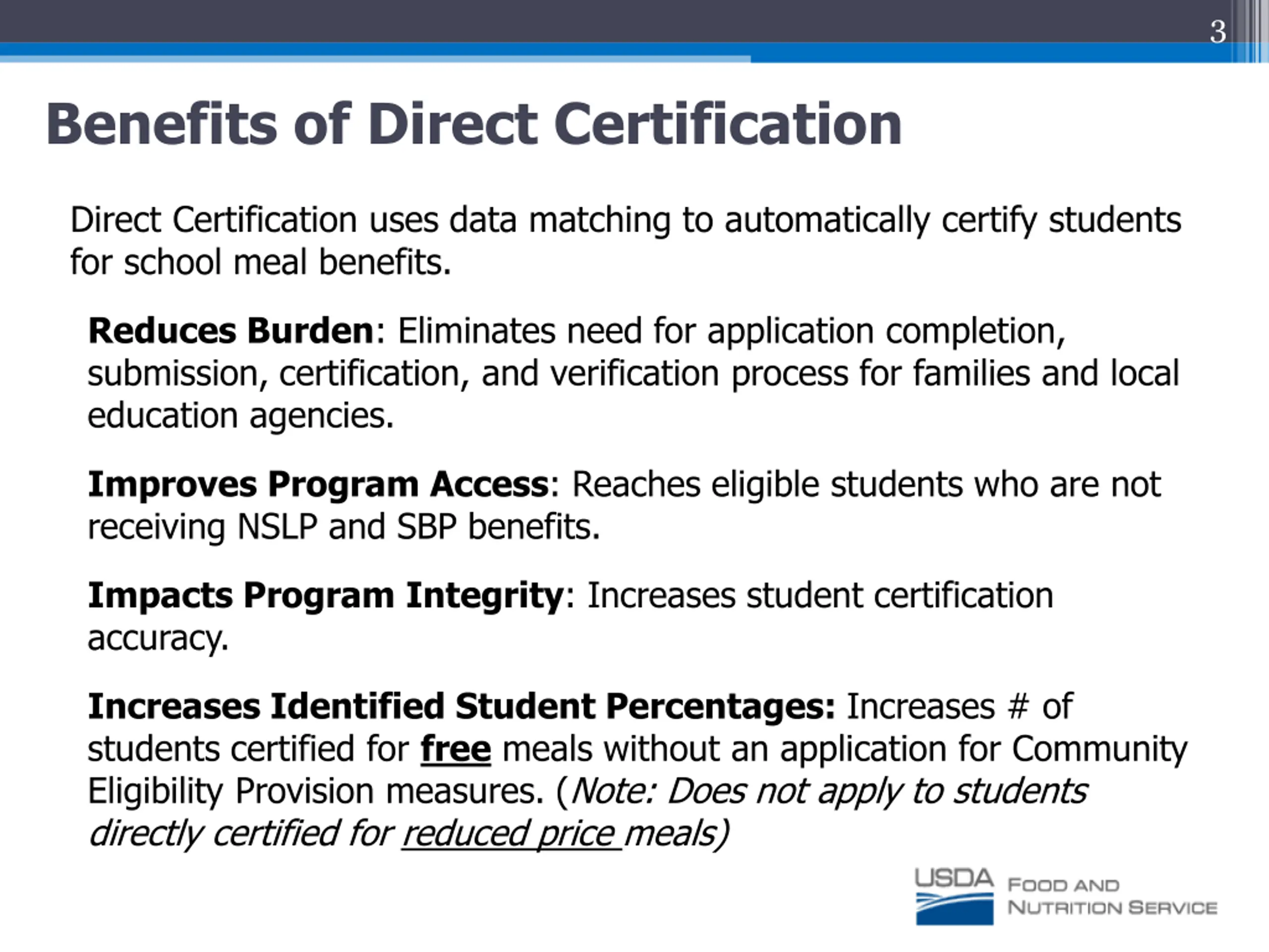 3 Benefits of Direct Certification Direct Certification uses data matching to automatically certify students for school meal benefits. Reduces Burden: Eliminates need for application completion, submission, certification, and verification process for families and local education agencies. Improves Program Access: Reaches eligible students who are not receiving NSLP and SBP benefits. Impacts Program Integrity: Increases student certification accuracy. Increases Identified Student Percentages: Increases # of students certified for free meals without an application for Community Eligibility Provision measures. (Note: Does not apply to students directly certified for reduced price meals)