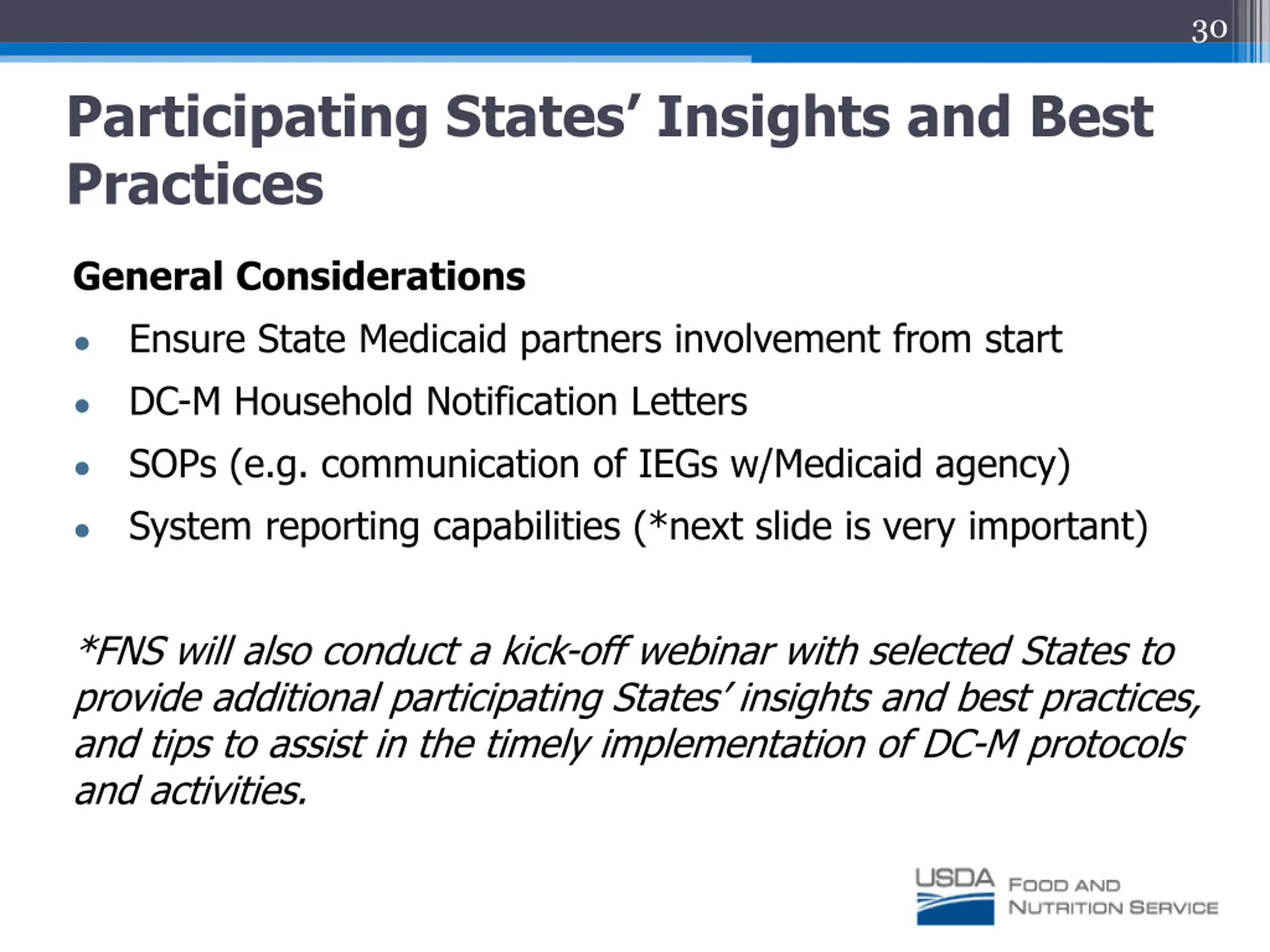 30 Participating States Insights and Best Practices General Considerations Ensure State Medicaid partners involvement from start DC-M Household Notification Letters SOPs (e.g. communication of IEGs w/Medicaid agency) System reporting capabilities (*next slide is very important) *FNS will also conduct a kick-off webinar with selected States to provide additional participating States insights and best practices, and tips to assist in the timely implementation of DC-M protocols and activities.