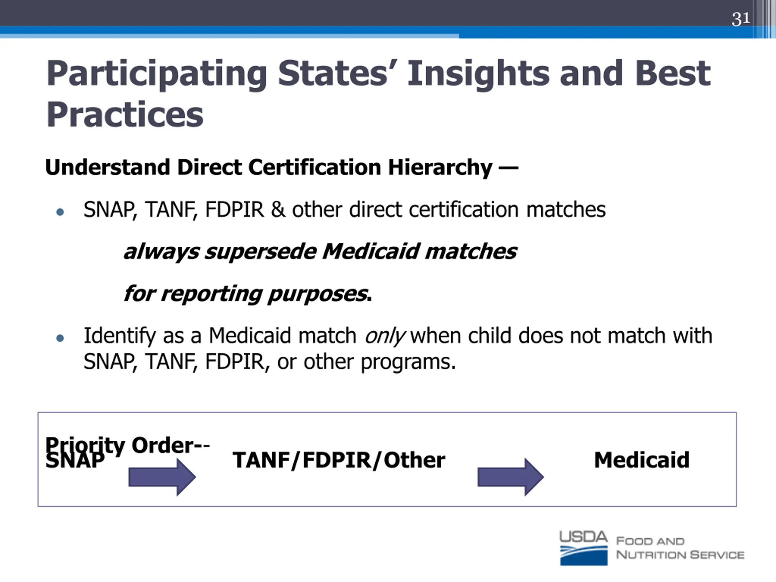 31 Participating States Insights and Best Practices Understand Direct Certification Hierarchy SNAP, TANF, FDPIR & other direct certification matches always supersede Medicaid matches for reporting purposes. Identify as a Medicaid match only when child does not match with SNAP, TANF, FDPIR, or other programs. Priority Order-- SNAP TANF/FDPIR/Other Medicaid