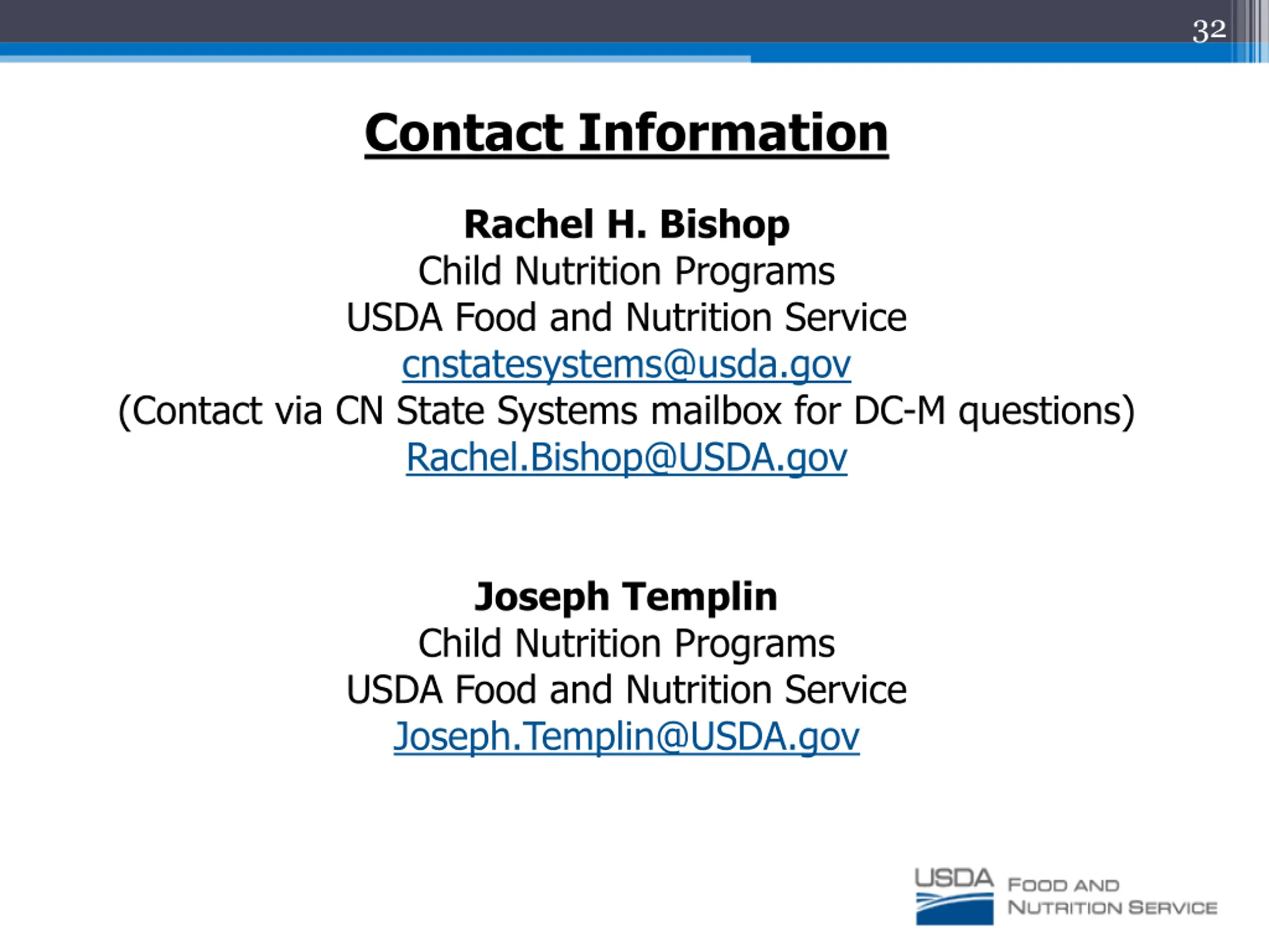 32 Contact Information Rachel H. Bishop Child Nutrition Programs USDA Food and Nutrition Service cnstatesystems@usda.gov (Contact via CN State Systems mailbox for DC-M questions) Rachel.Bishop@USDA.gov Joseph Templin Child Nutrition Programs USDA Food and Nutrition Service Joseph.Templin@USDA.gov