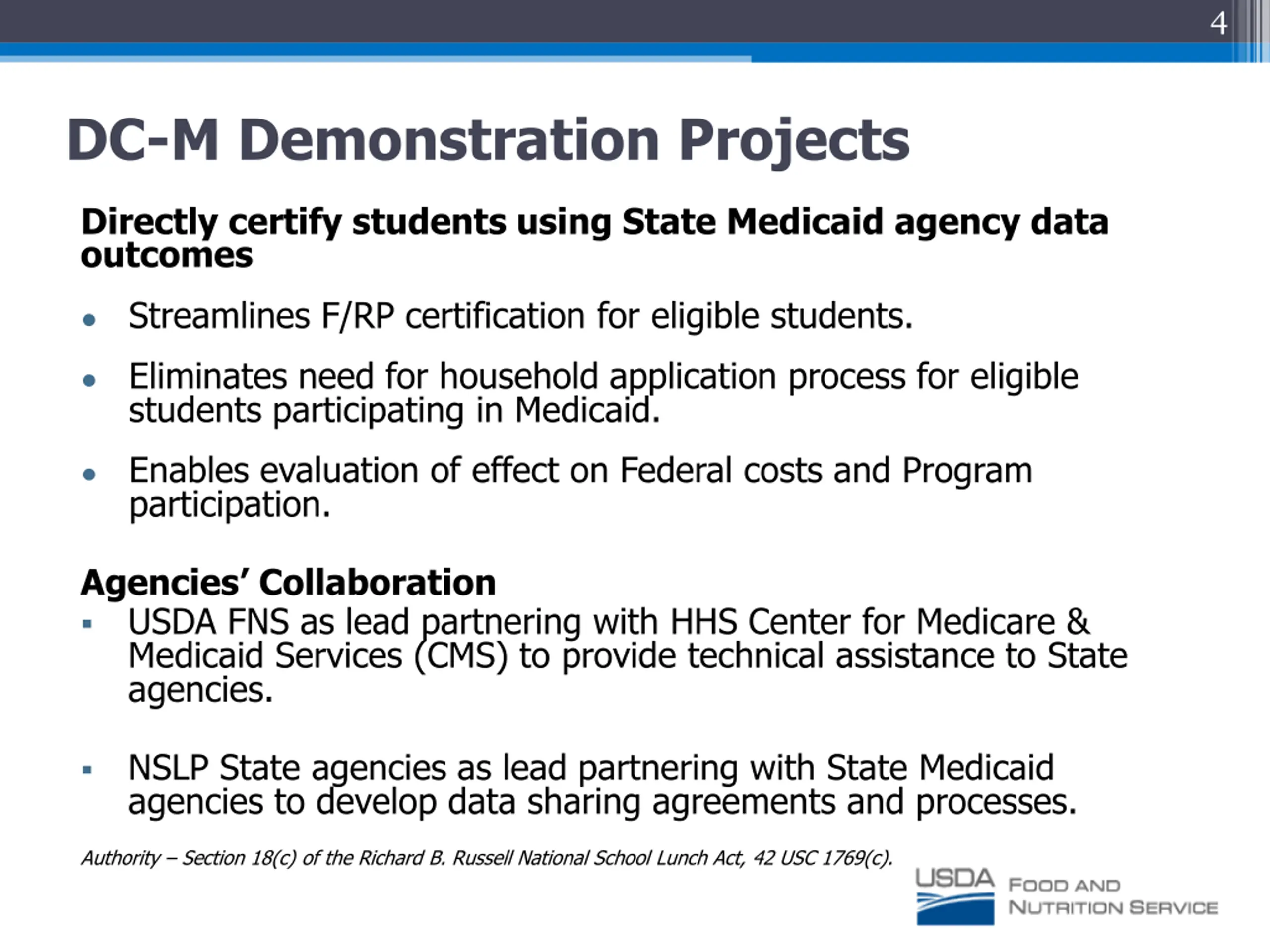 4 DC-M Demonstration Projects Directly certify students using State Medicaid agency data outcomes Streamlines F/RP certification for eligible students. Eliminates need for household application process for eligible students participating in Medicaid. Enables evaluation of effect on Federal costs and Program participation. Agencies Collaboration USDA FNS as lead partnering with HHS Center for Medicare & Medicaid Services (CMS) to provide technical assistance to State agencies. NSLP State agencies as lead partnering with State Medicaid agencies to develop data sharing agreements and processes. Authority Section 18(c) of the Richard B. Russell National School Lunch Act, 42 USC 1769(c).