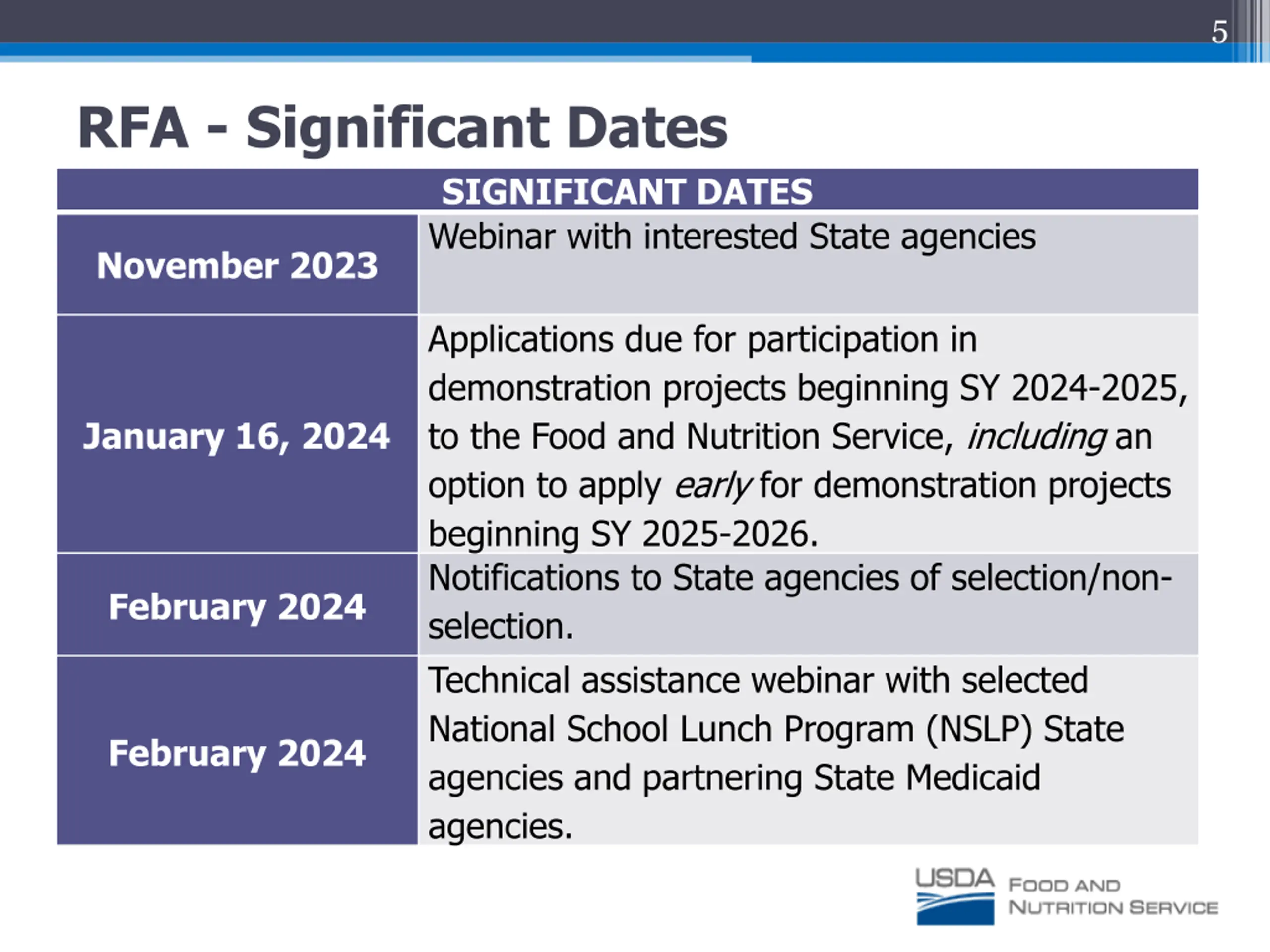 5 RFA - Significant Dates SIGNIFICANT DATES Webinar with interested State agencies November 2023 Applications due for participation in demonstration projects beginning SY 2024-2025, to the Food and Nutrition Service, including an option to apply early for demonstration projects beginning SY 2025-2026. Notifications to State agencies of selection/non- selection. Technical assistance webinar with selected National School Lunch Program (NSLP) State agencies and partnering State Medicaid agencies. January 16, 2024 February 2024 February 2024