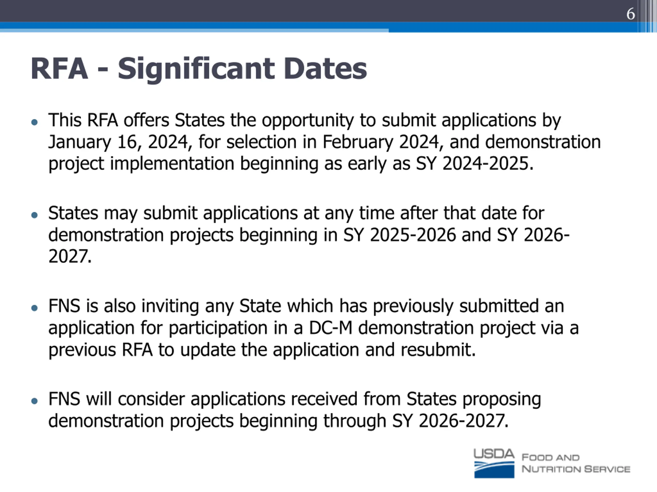6 RFA - Significant Dates This RFA offers States the opportunity to submit applications by January 16, 2024, for selection in February 2024, and demonstration project implementation beginning as early as SY 2024-2025. States may submit applications at any time after that date for demonstration projects beginning in SY 2025-2026 and SY 2026- 2027. FNS is also inviting any State which has previously submitted an application for participation in a DC-M demonstration project via a previous RFA to update the application and resubmit. FNS will consider applications received from States proposing demonstration projects beginning through SY 2026-2027.