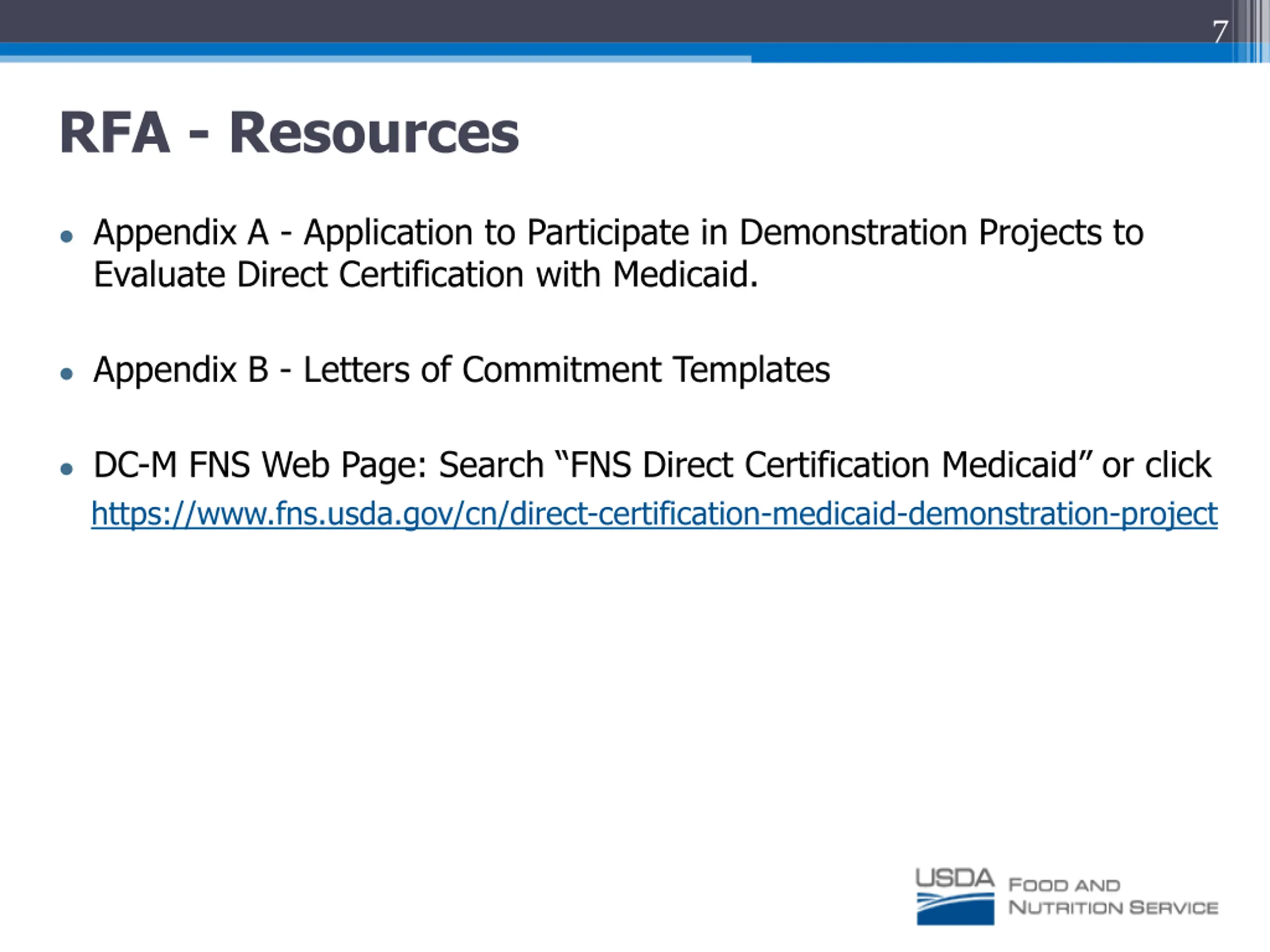 7 RFA - Resources Appendix A - Application to Participate in Demonstration Projects to Evaluate Direct Certification with Medicaid. Appendix B - Letters of Commitment Templates DC-M FNS Web Page: Search FNS Direct Certification Medicaid or click https://www.fns.usda.gov/cn/direct-certification-medicaid-demonstration-project