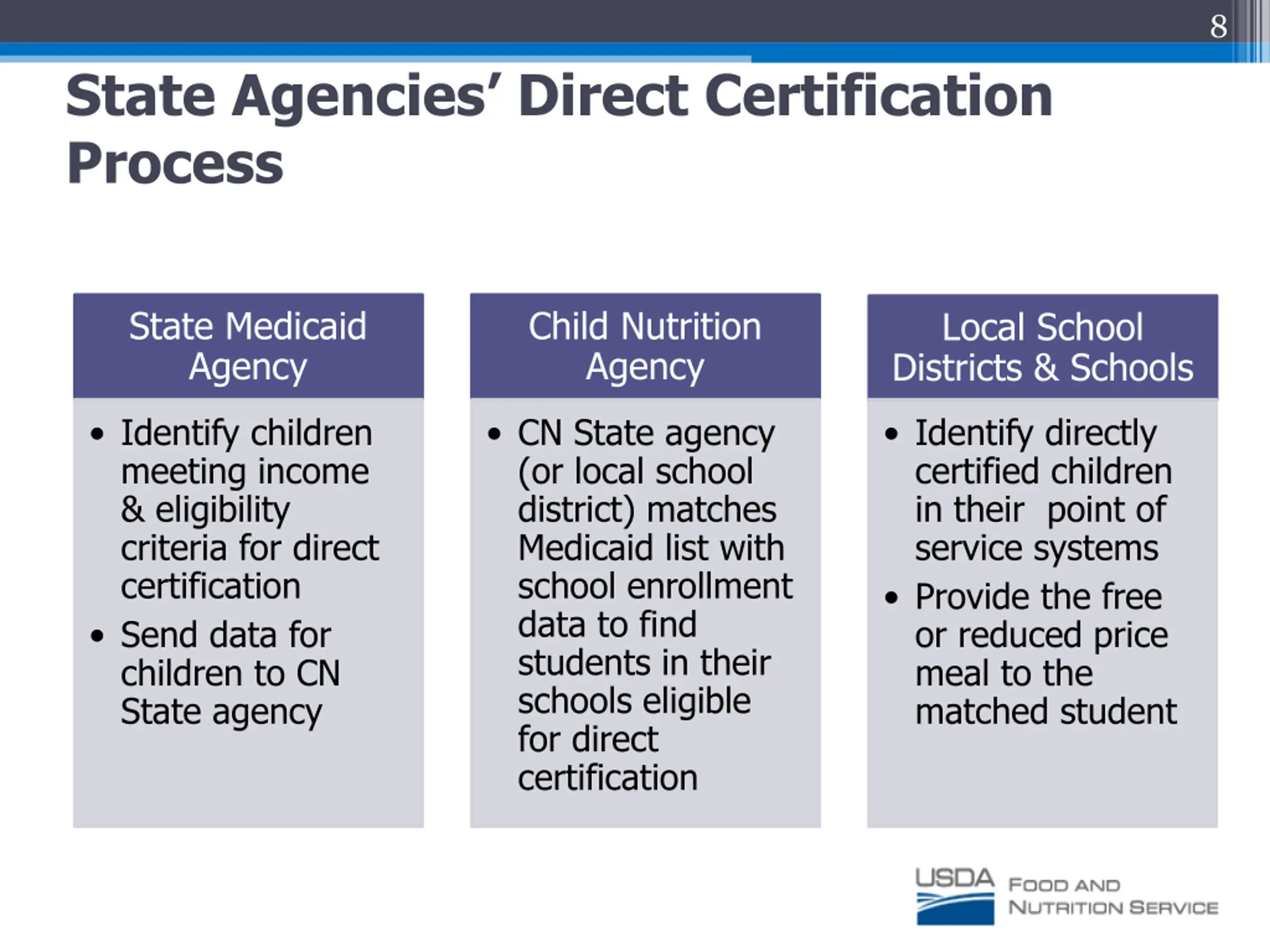8 State Agencies Direct Certification Process State Medicaid Agency Child Nutrition Agency Local School Districts & Schools Identify children meeting income & eligibility criteria for direct certification Send data for children to CN State agency CN State agency (or local school district) matches Medicaid list with school enrollment data to find students in their schools eligible for direct certification Identify directly certified children in their point of service systems Provide the free or reduced price meal to the matched student