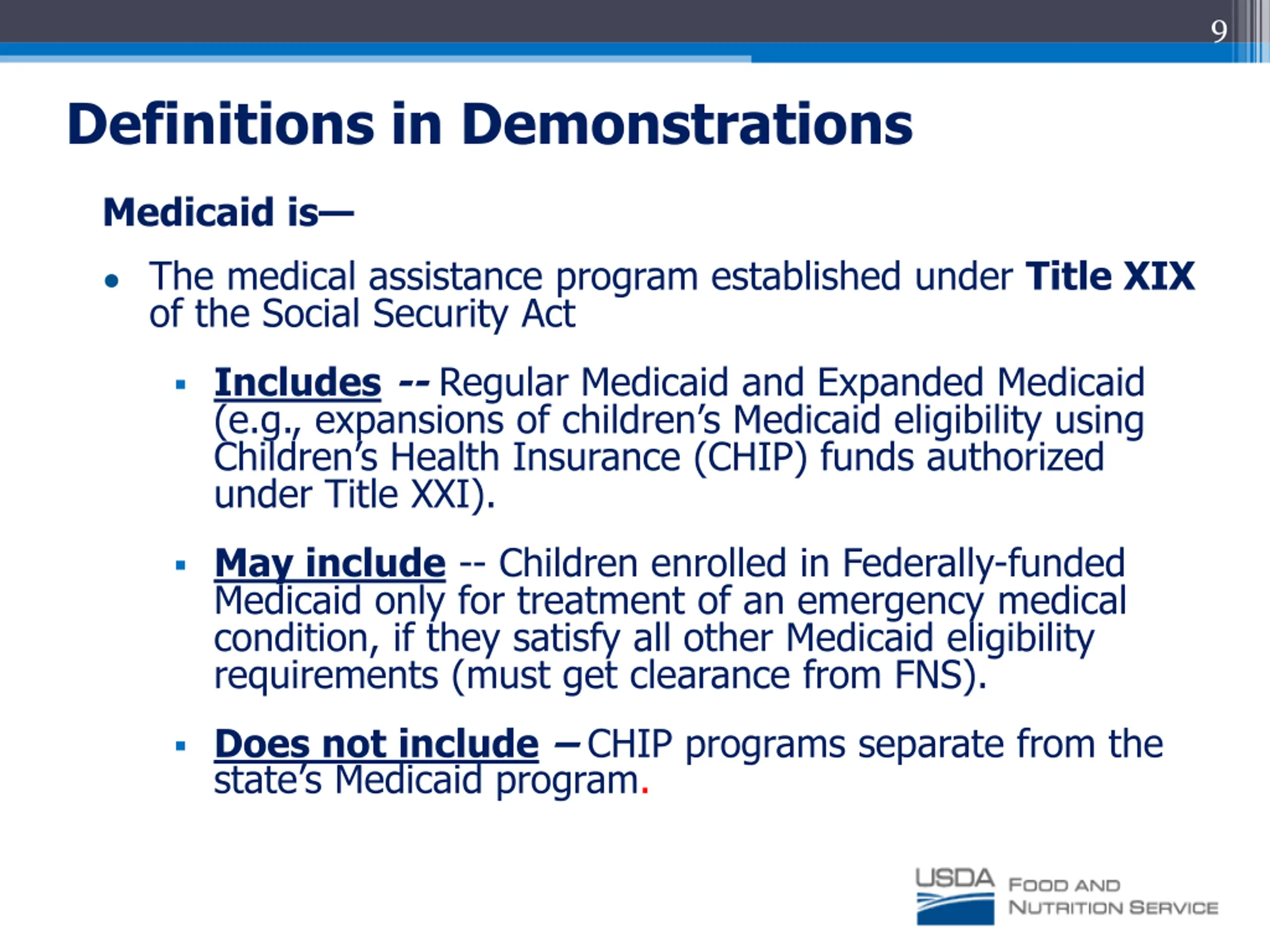9 Definitions in Demonstrations Medicaid is The medical assistance program established under Title XIX of the Social Security Act Includes -- Regular Medicaid and Expanded Medicaid (e.g., expansions of children s Medicaid eligibility using Children s Health Insurance (CHIP) funds authorized under Title XXI). May include -- Children enrolled in Federally-funded Medicaid only for treatment of an emergency medical condition, if they satisfy all other Medicaid eligibility requirements (must get clearance from FNS). Does not include CHIP programs separate from the state s Medicaid program.
